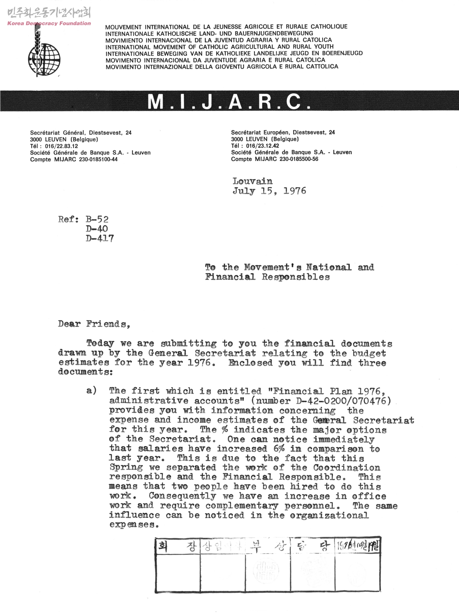 To the Movement's National and Financial Responsibles[수신:한국가톨릭농민회,발신:Bernard CARREL]
