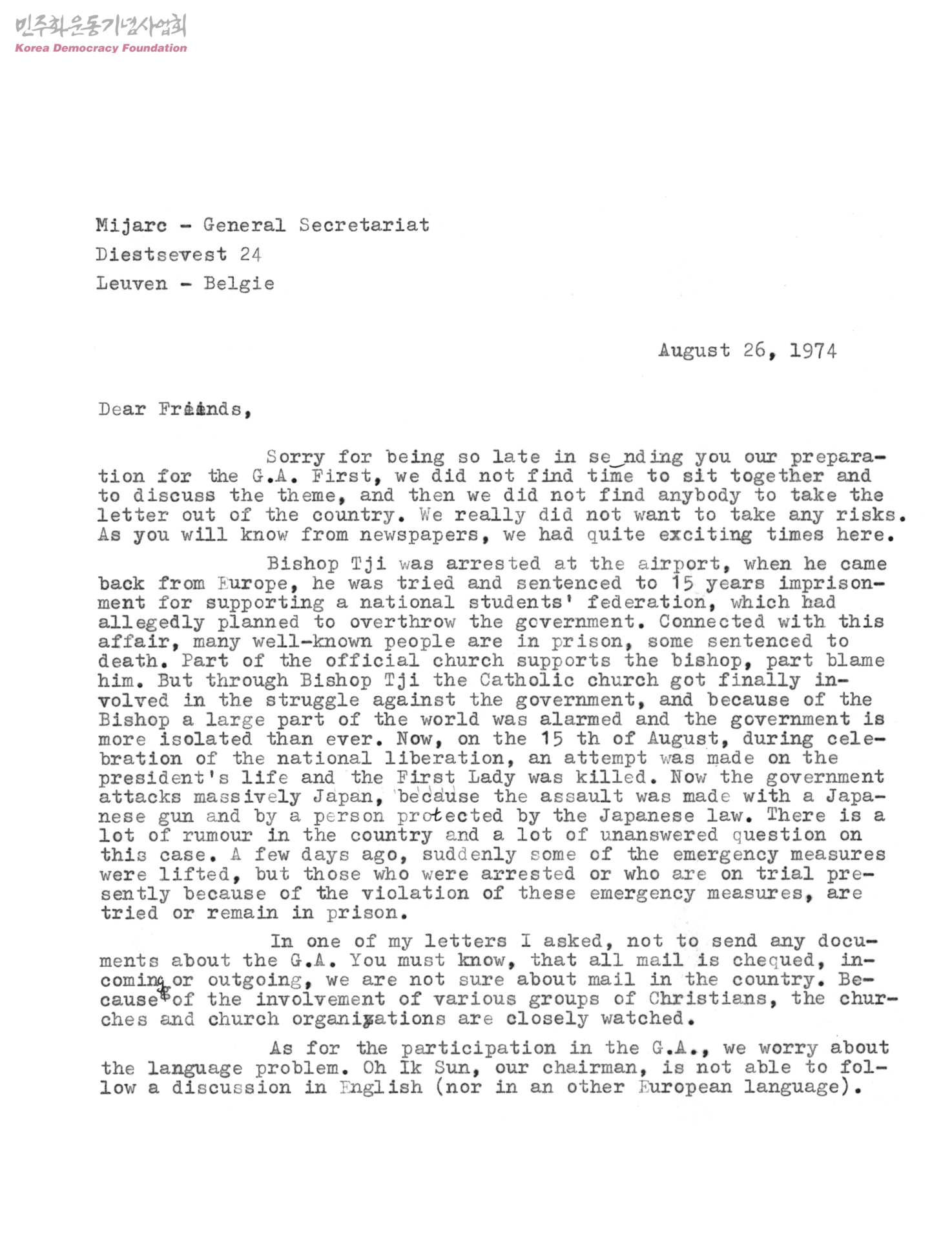 [한국가톨릭농민회가 MIJARC's General Secretariat 에 보내는 G.A.준비에 관한 편지]