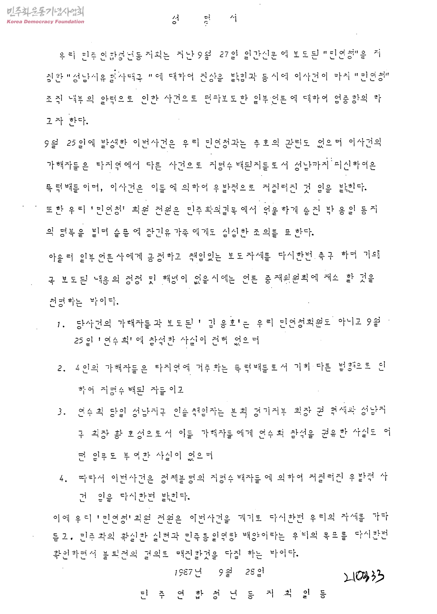 - 민주연합청년동지회일동