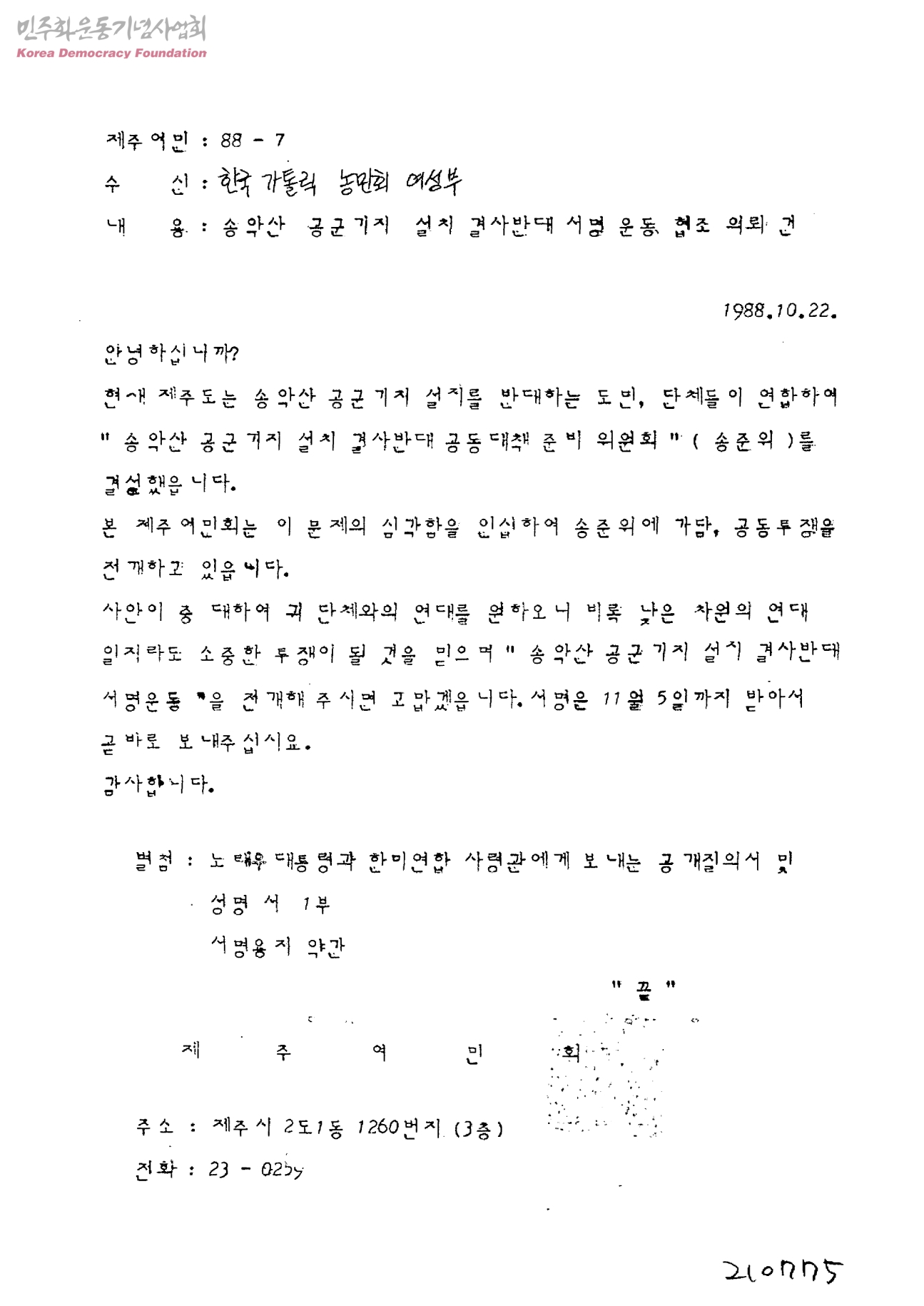 송악산 공군기지 설치 결사반대 서명 운동 협조 의뢰 건[수신:한국가톨릭농민회 여성부,발신:제주여민회]