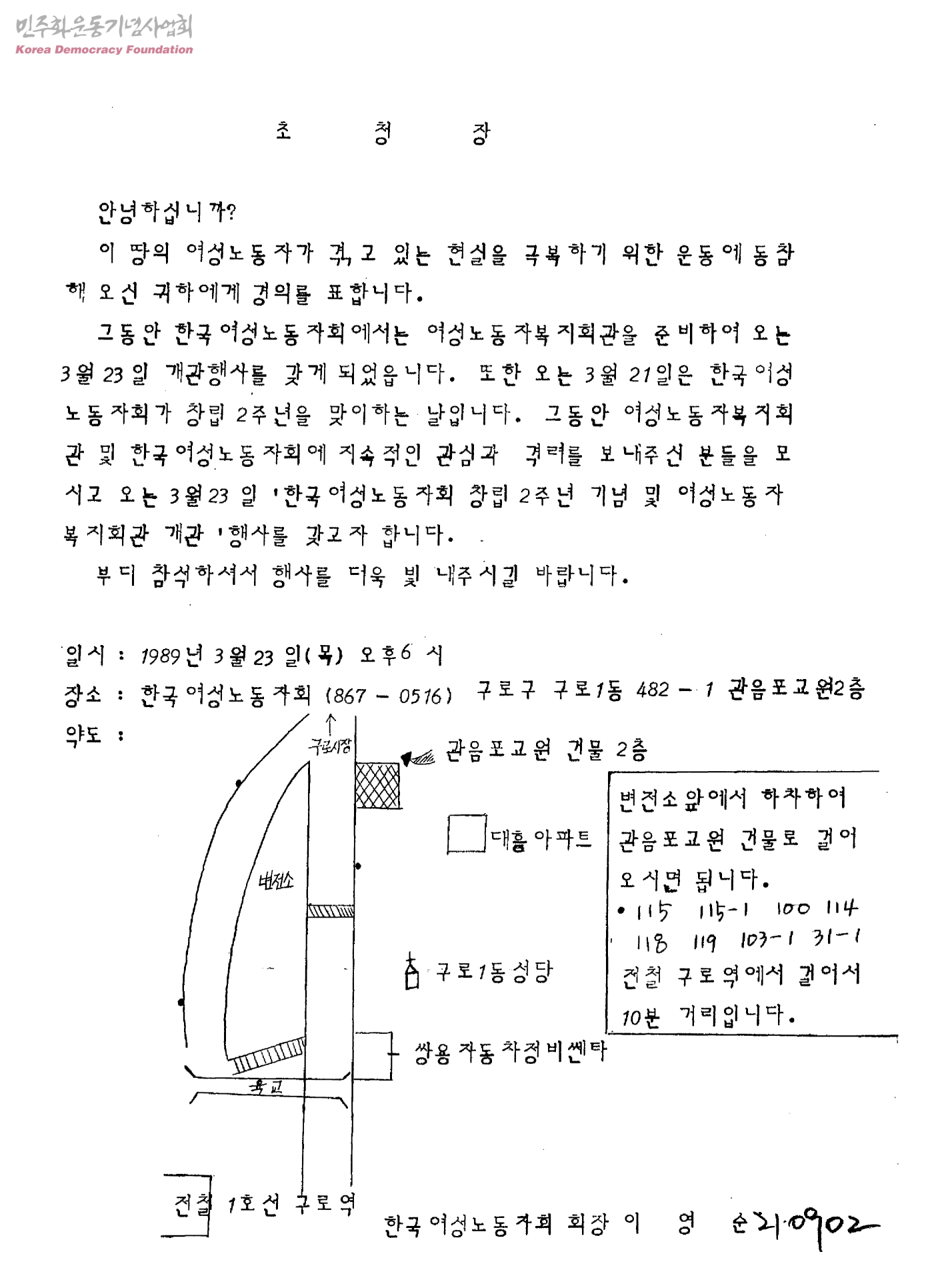 초청장[한국여성노동자회 창립2주년 기념 및 여성노동자복지회관 개관 행사 관련]