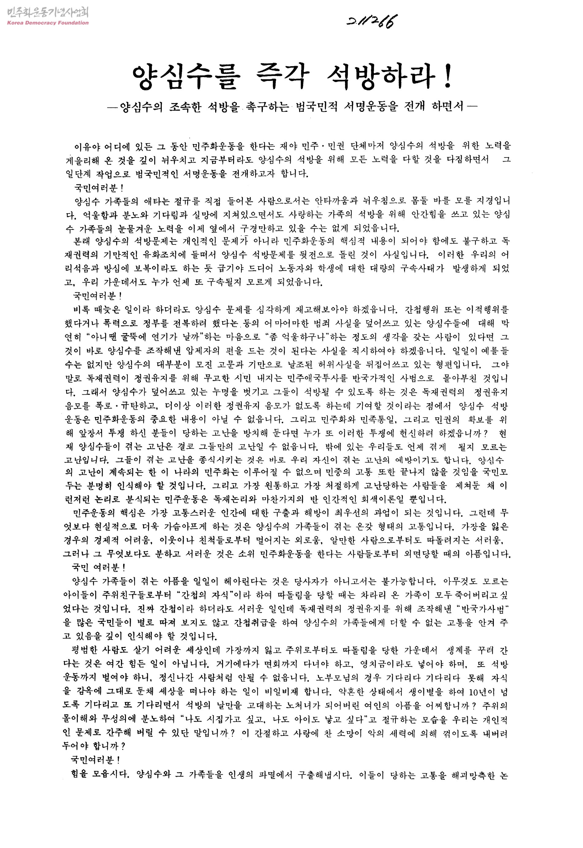 양심수를 즉각 석방하라!-양심수의 조속한 석방을 추구하는 범국민적 서명운동을 전개 하면서