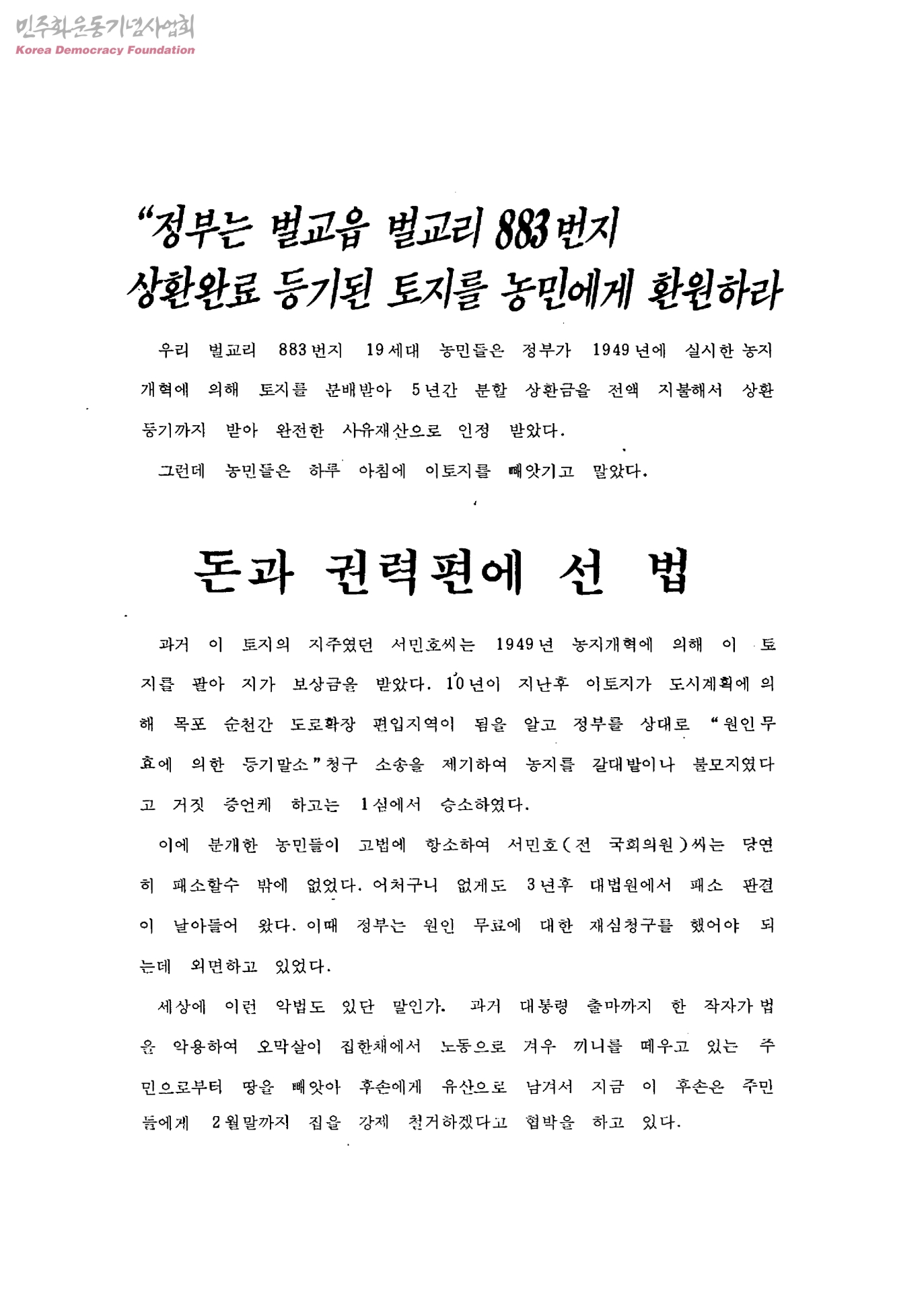 정부는 벌교읍 벌교리 883번지 상환완료 등기된 토지를 농민에게 환원하라