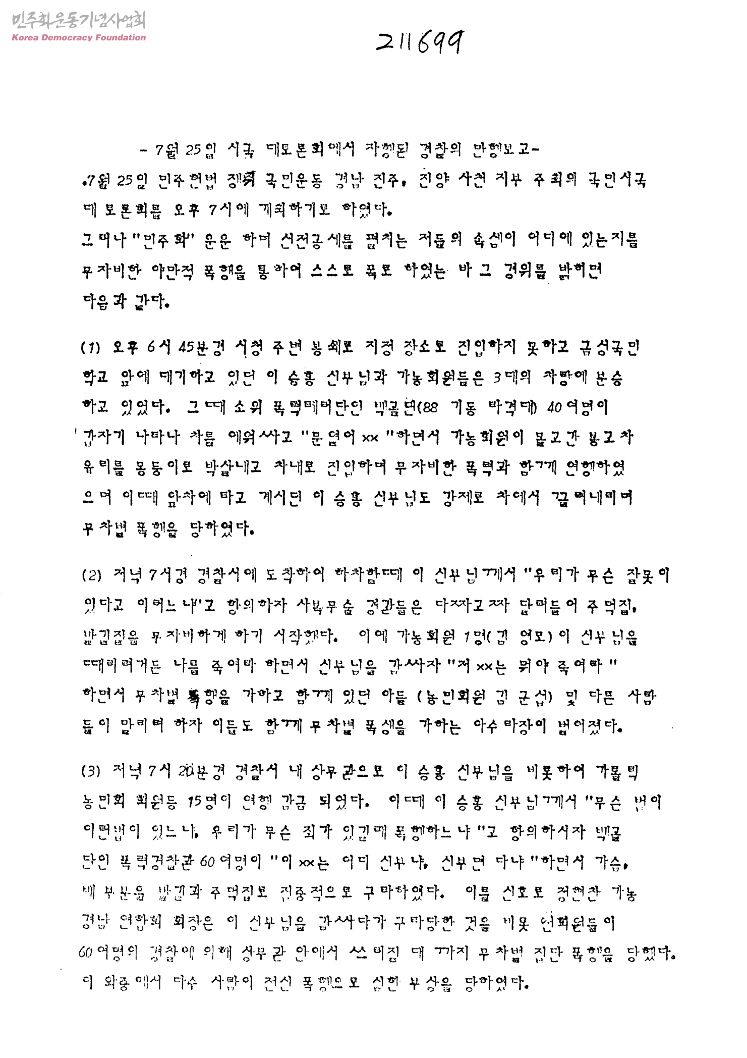 7월 25일 시국 대토론회에서 자행된 경찰의 만행보고