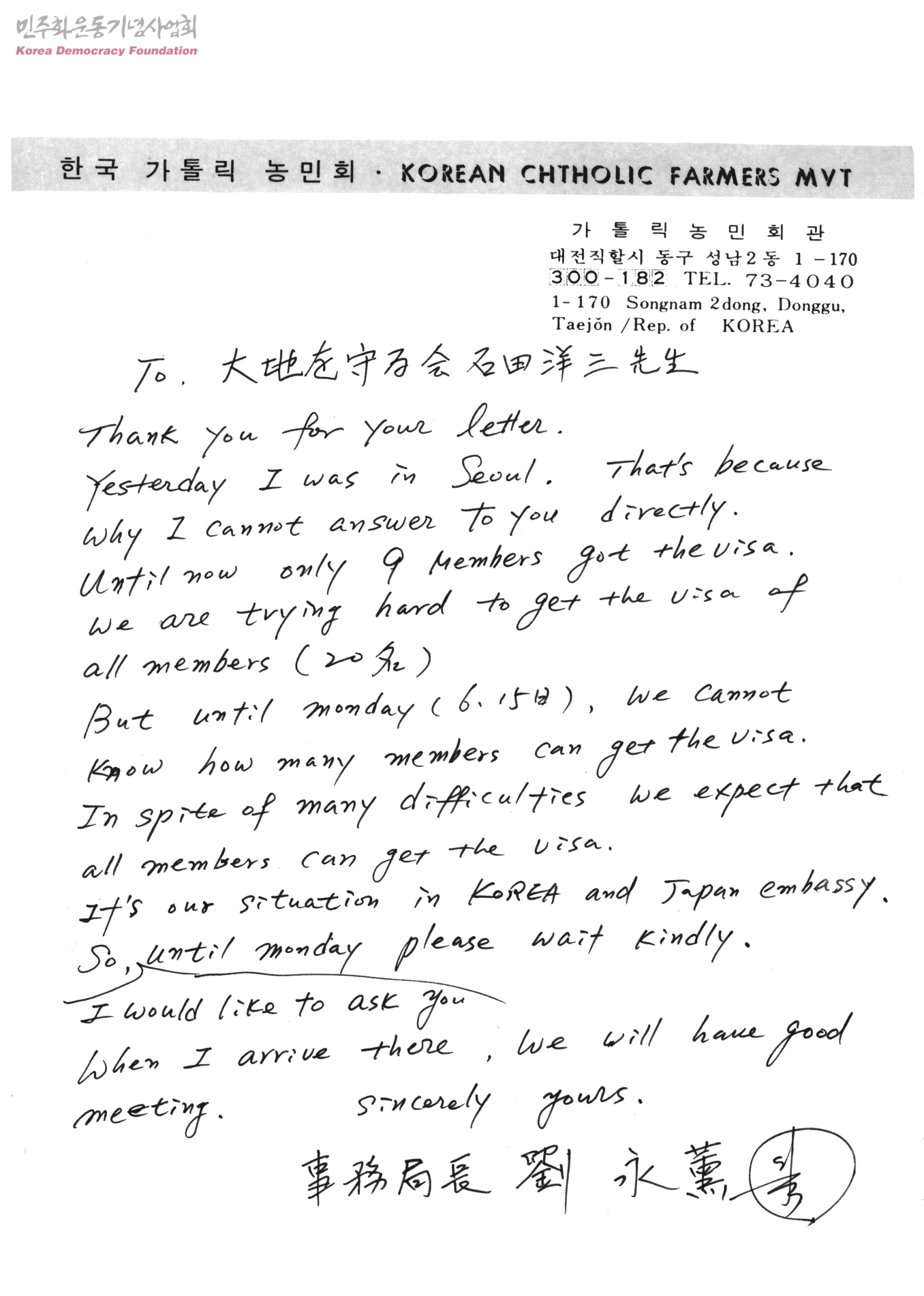 [가농 사무국장 유영훈이 일본연수와 관련하여 大地を守る會의 石田洋三에게 보내는 편지글]