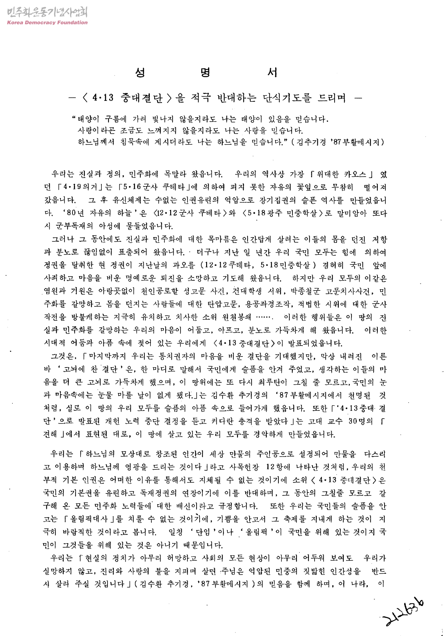 성명서-4.13 중대결단을 적극 반대하는 단식기도를 드리며