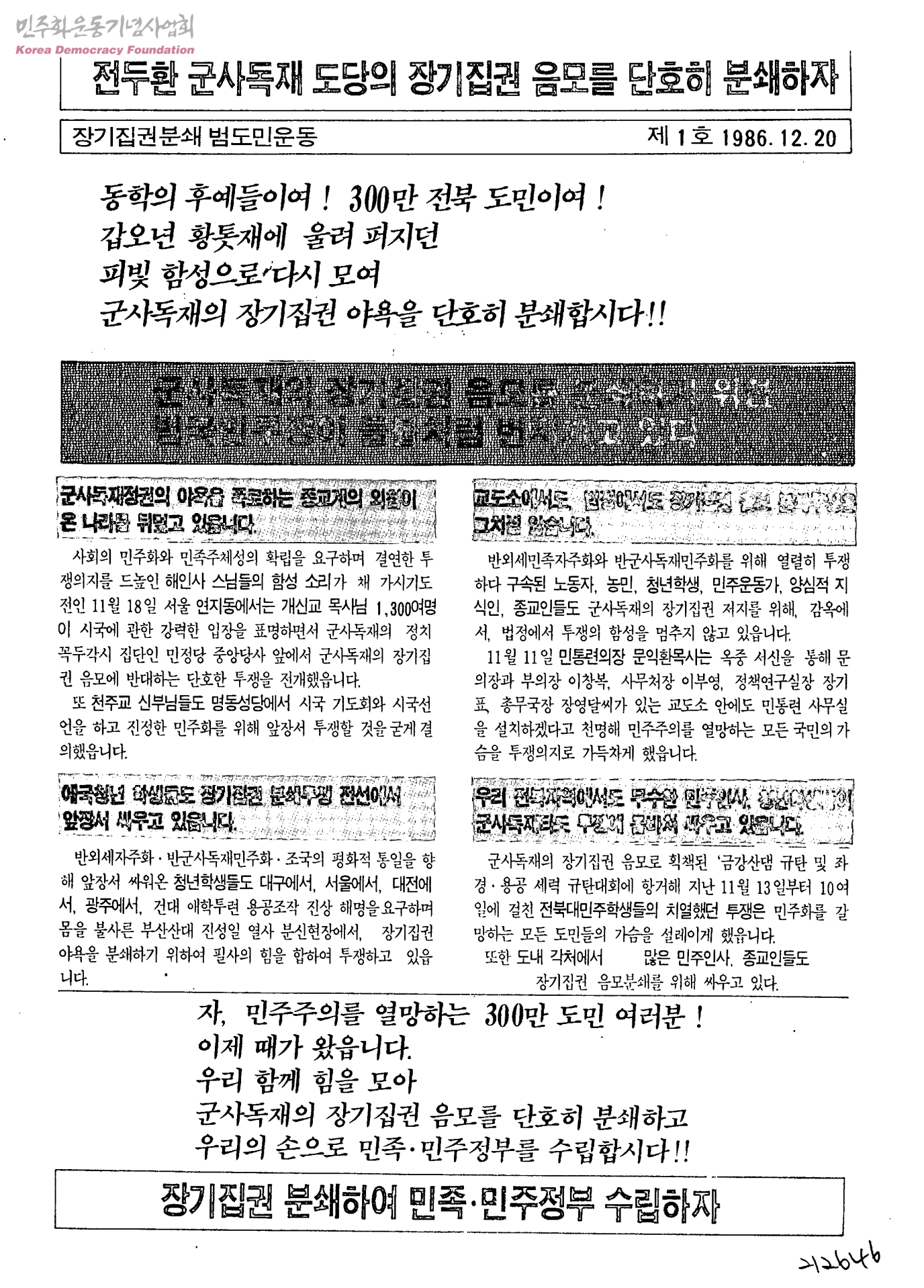 장기집권분쇄범도민운동 제1호-전두환 군사독재 도당의 장기집권 음모를 단호히 분쇄하자