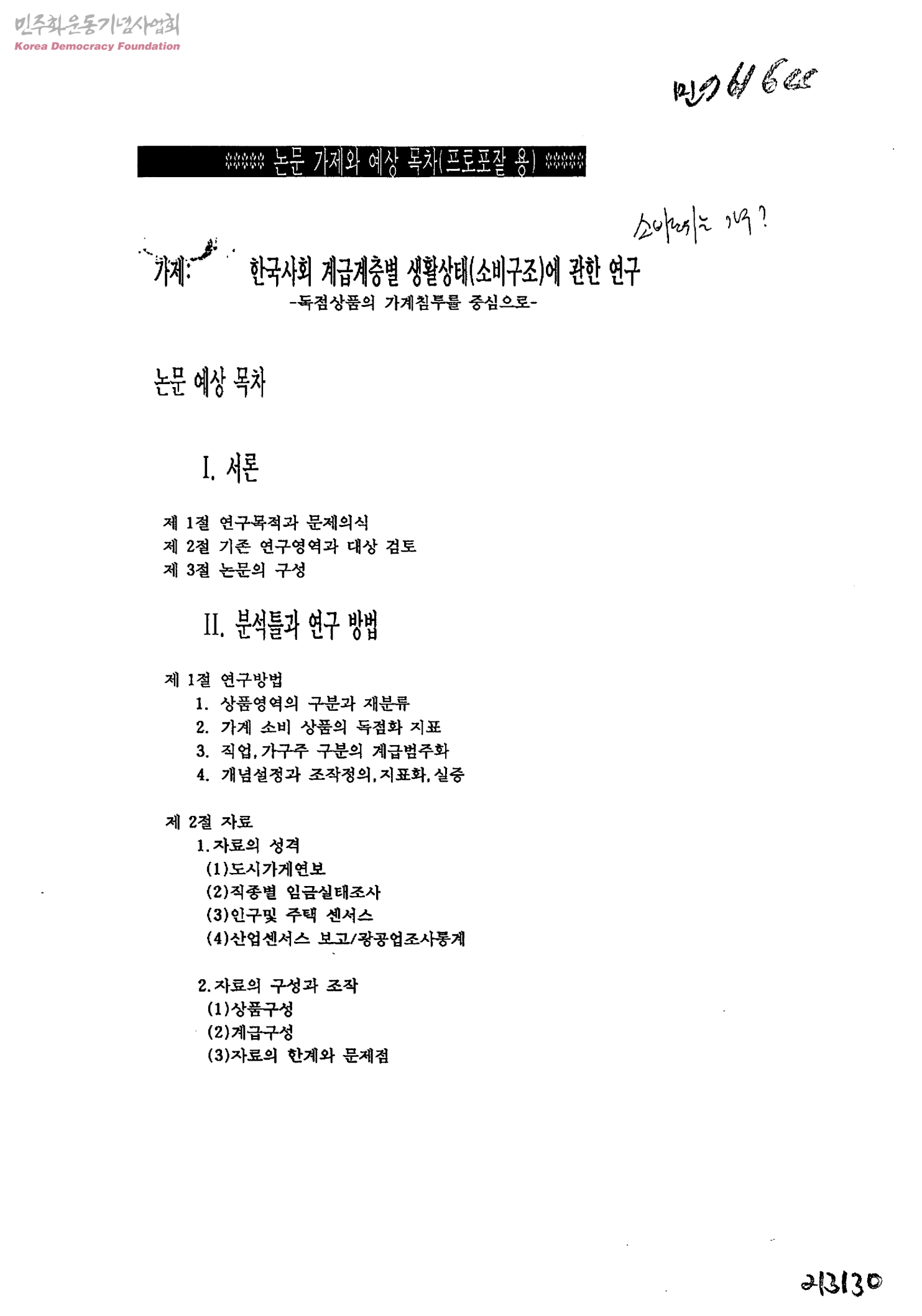 논문 가제와 예상 목차(프로포잘 용)-한국사회 계급계층별 생활상태(소비구조)에 관한 연구