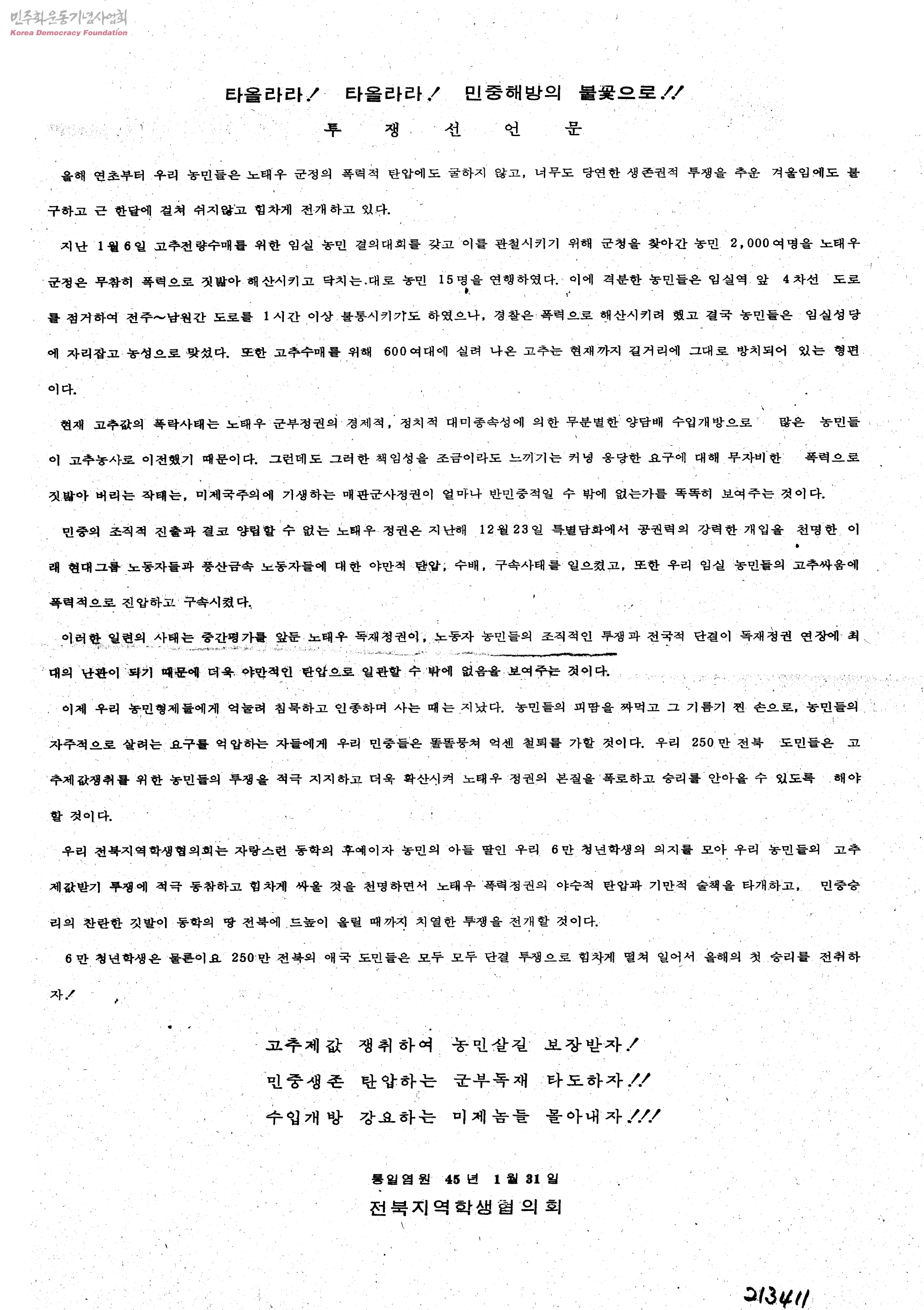 타올라라! 타올라라! 민중해방의 불꽃으로!!-투쟁선언문
