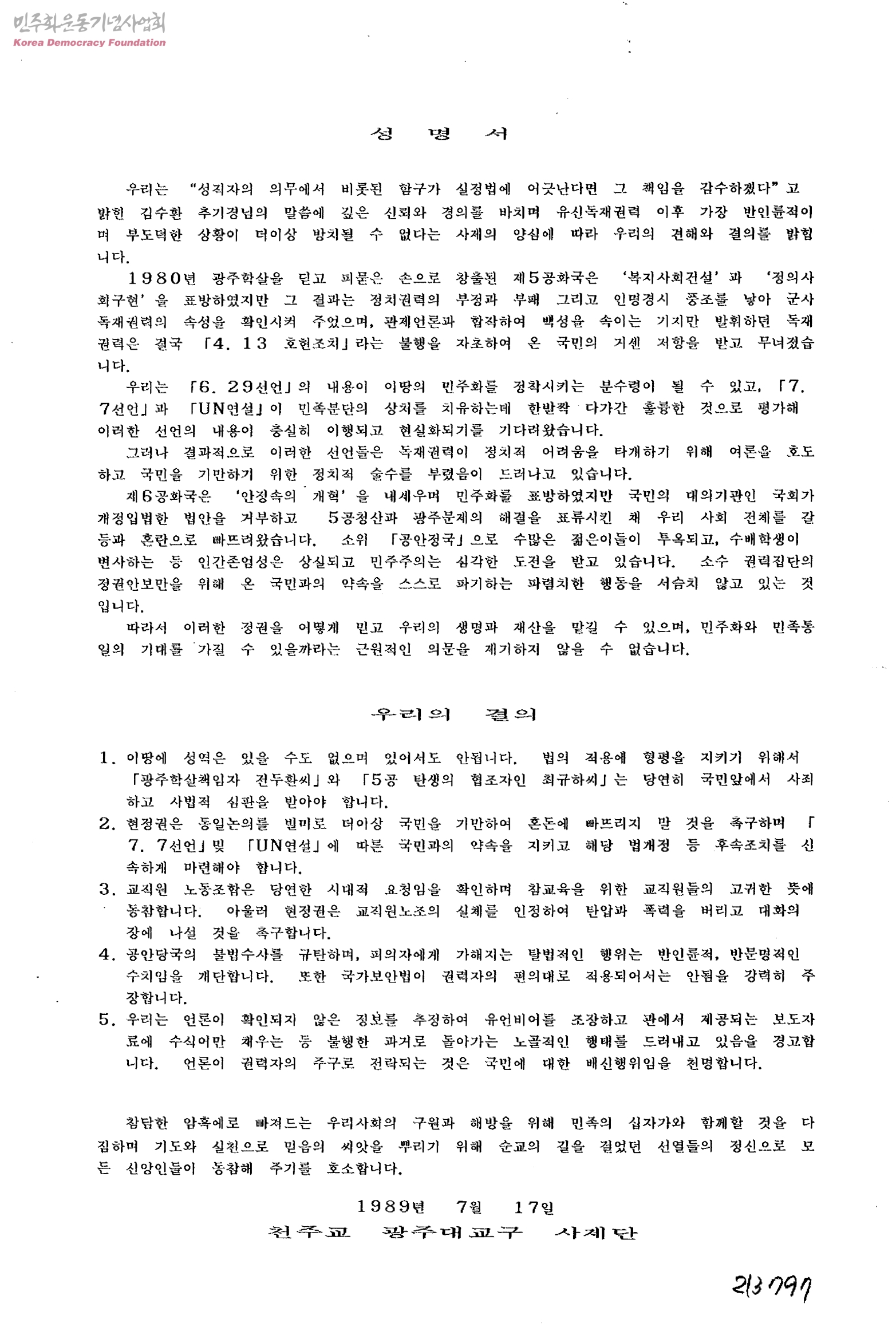성명서[공안정국과 관련]