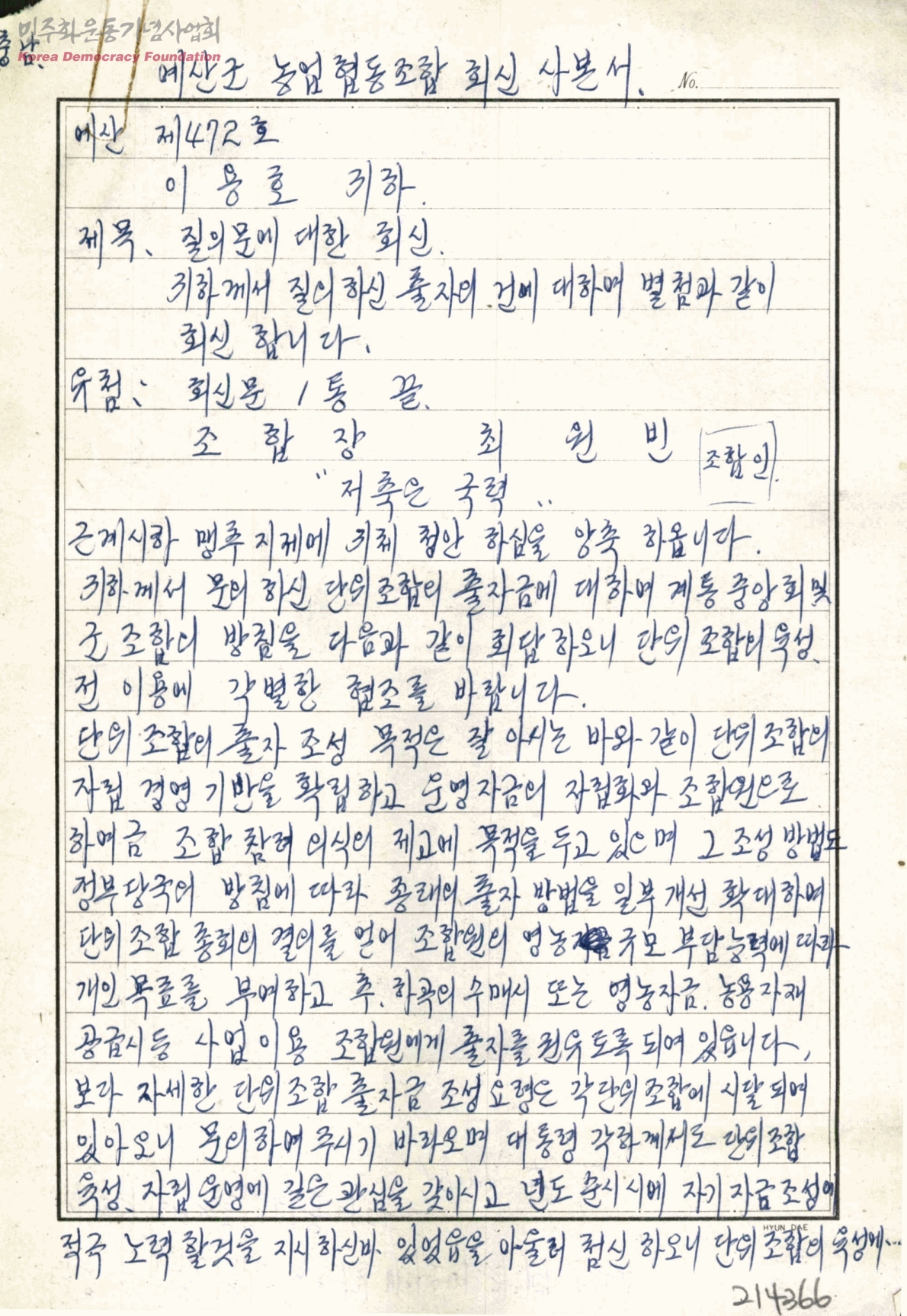 질의문에 대한 회신[예산군 농업협동조합 회신 사본서]