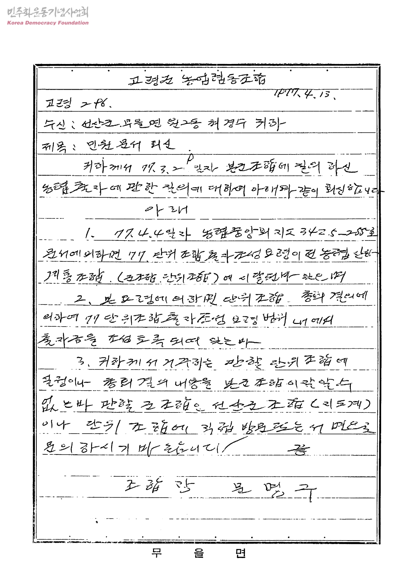 민원문서 회신[수신:선산군 무을면 원2동 최경수,발신:고령군농업협동조합장 문명구]