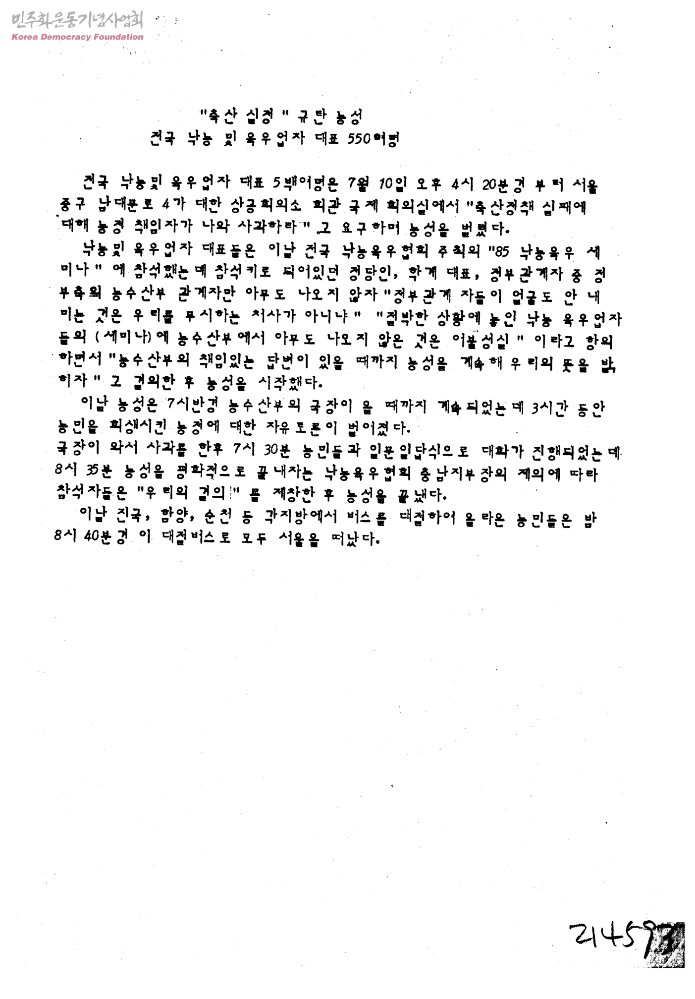 축산 실정 규탄 농성 전국 낙농 및 육우업자 대표 550여명