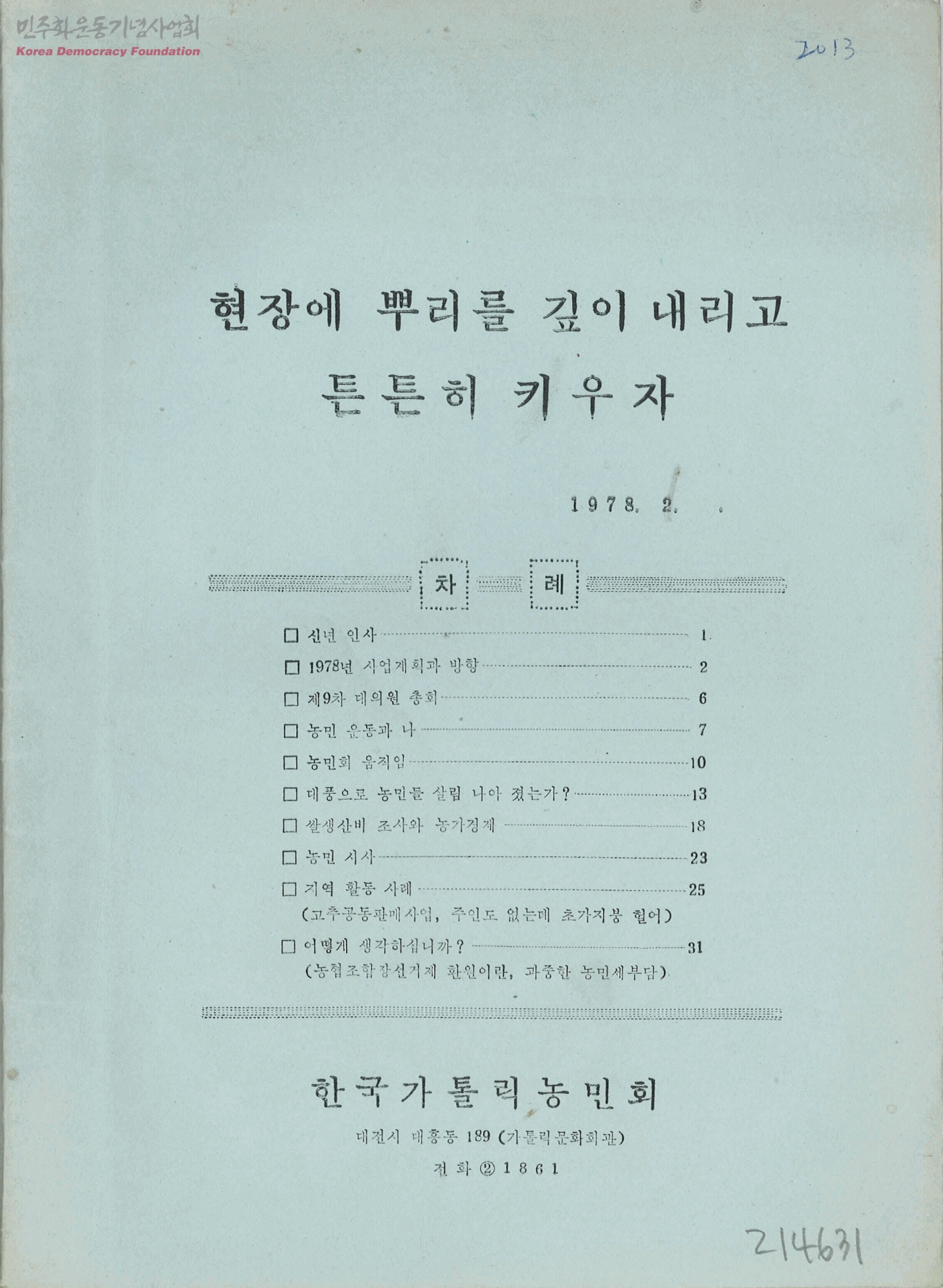 - - 1978년 사업계획과 방향 - 제9차 대의원총회 - 농민운동과 나 - 농민회 움직임 - 대풍으로 농민들 살림 나아졌는가? - 쌀생산비 조사와 농가경제 - 농민 시사 - 지역활동 사례 : 고추공동판매사업, 주인도 없는데 초가지붕 헐어 - 어떻게 생각하십니까? : 농협조합장선거제 환원이란, 과중한 농민세부담