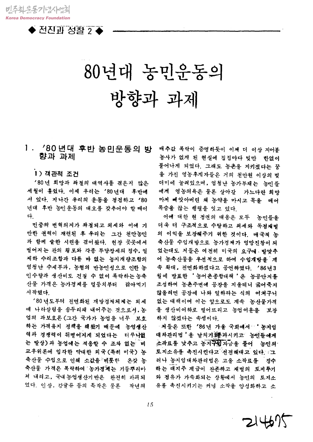 - 1. '80년대 후반 농민운동의 방향과 과제 2. '86년 농민운동의 평가 3. '80년대 후반 농민운동의 방향과 과제