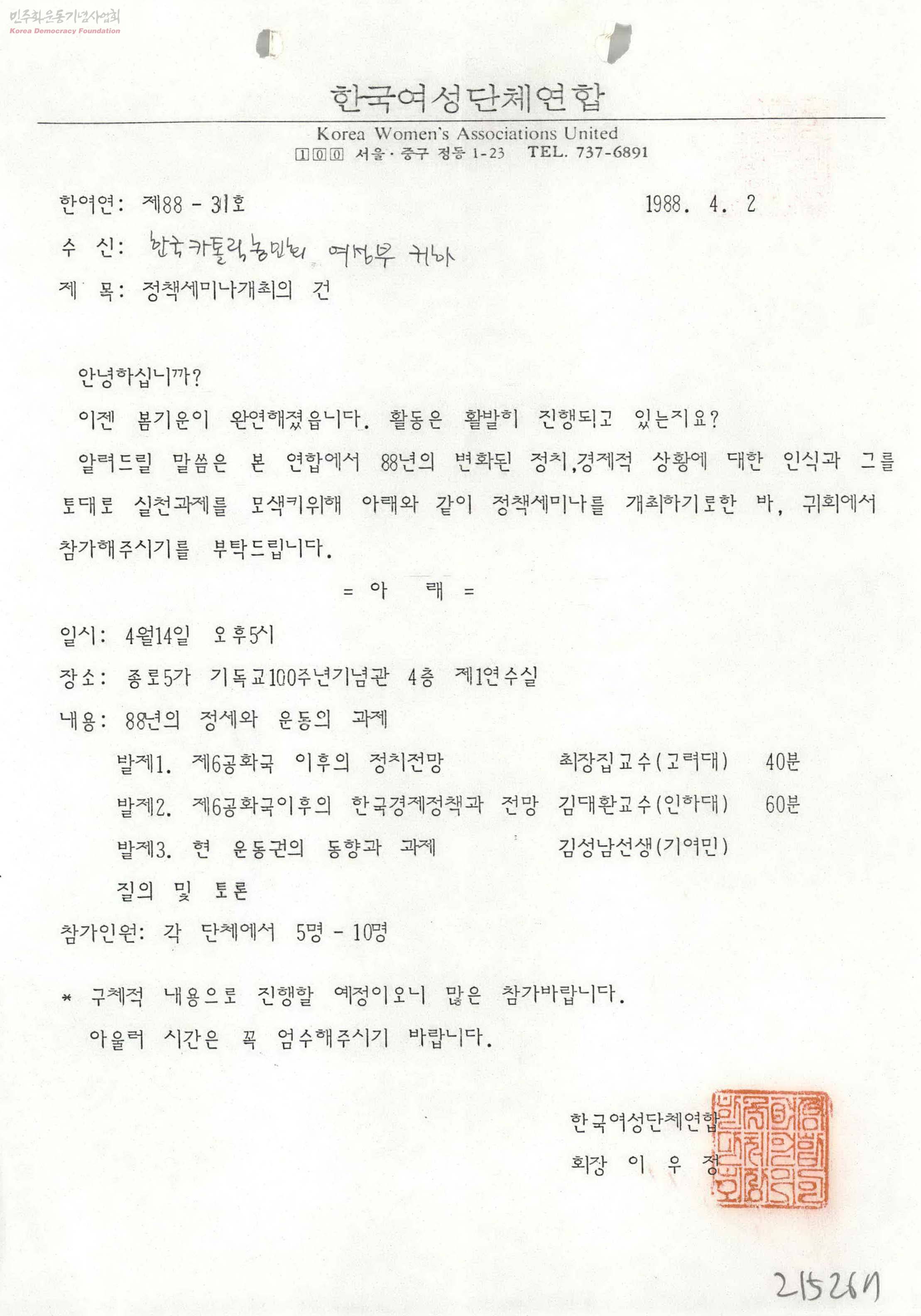 - 88년의 변화된 정치, 경제적 상황에 대한 인식과 그를 토대로 실천과제를 모색키 위한 정책세미나 개최 안내.