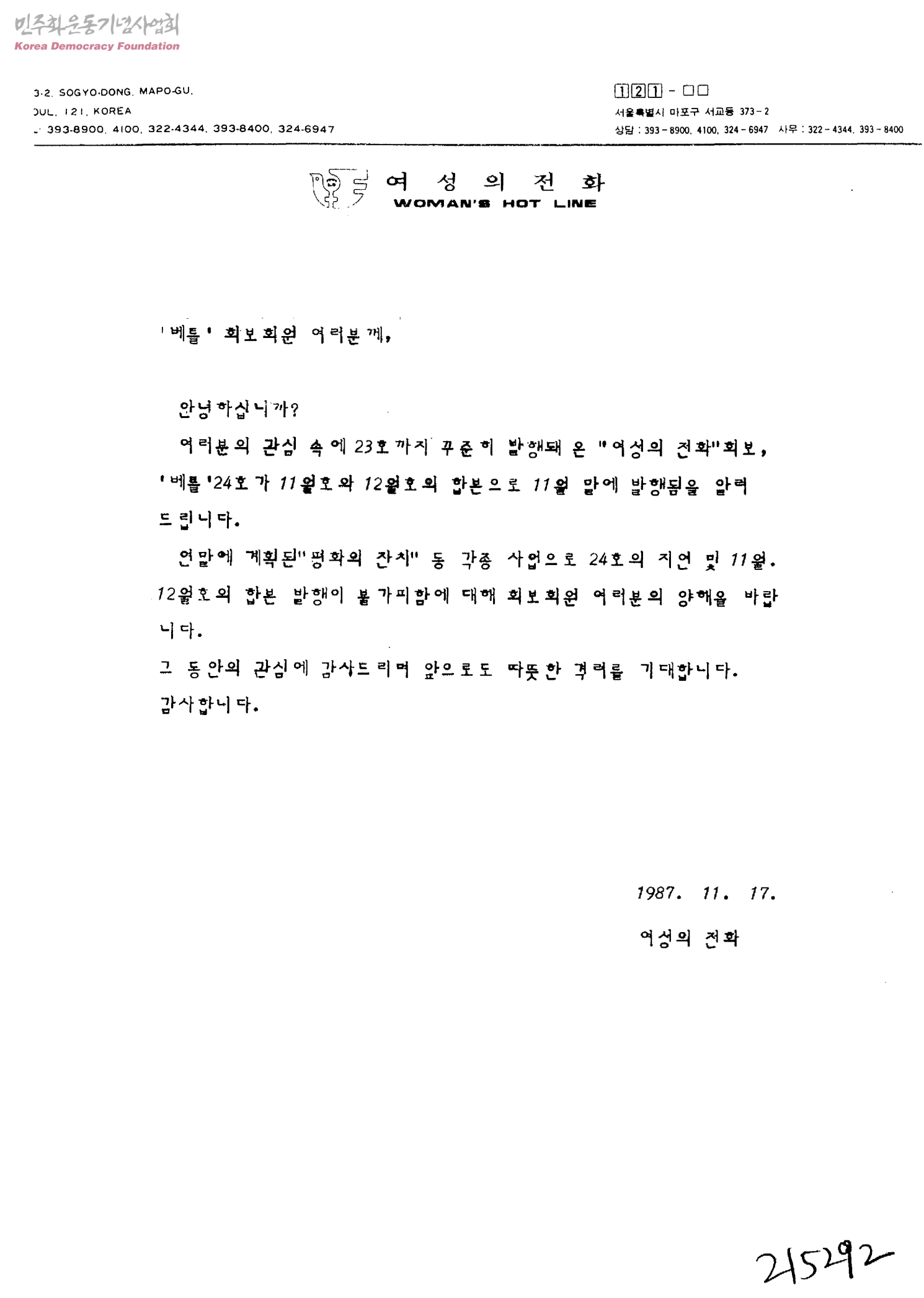 [여성의 전화가 베틀회보 회원에게 보내는 베틀24호가 합본으로 발행됨을 알리는 문서]
