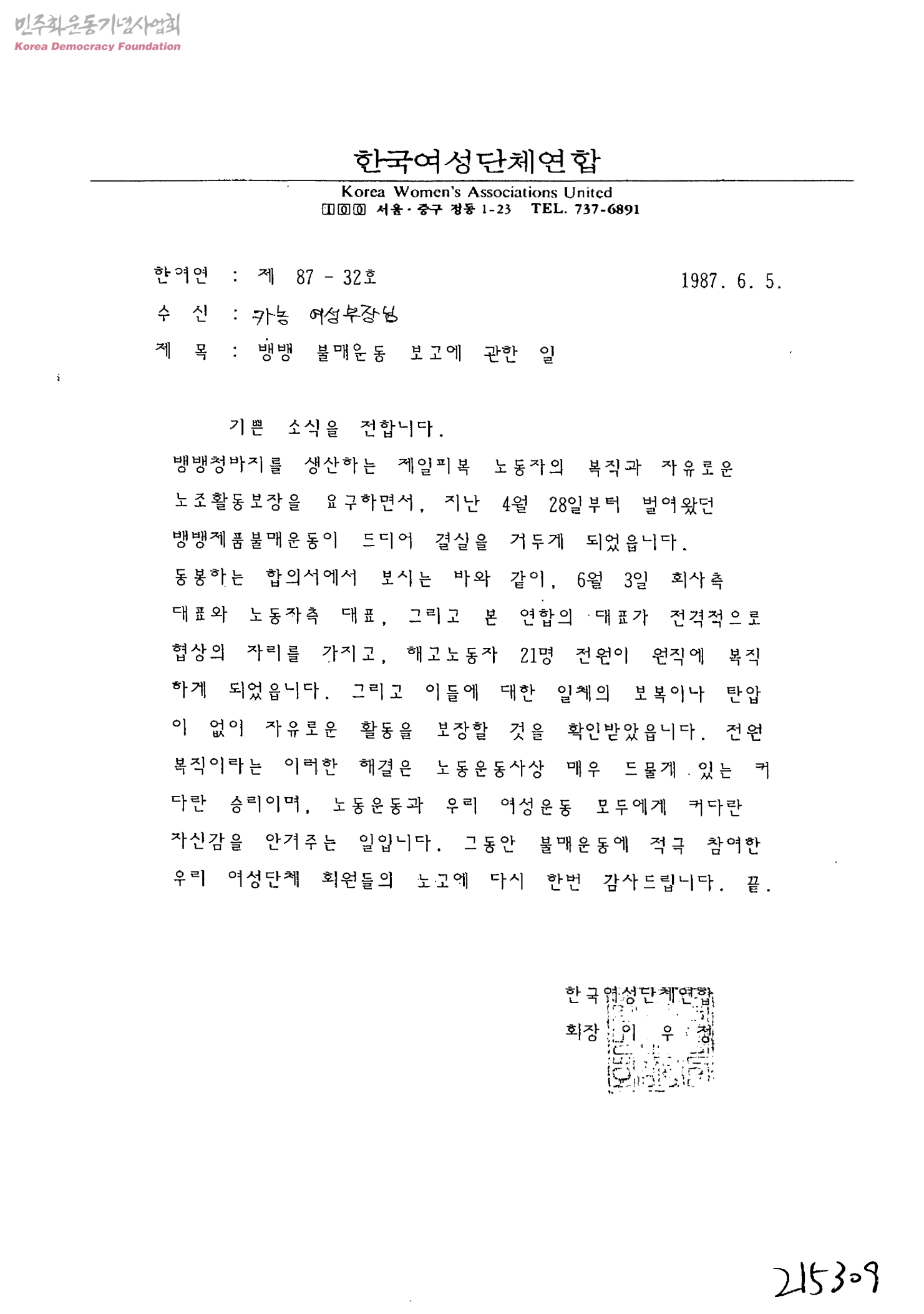 뱅뱅 불매운동 보고에 관한 일[수신:한국가톨릭농민회 여성부장,발신:한국여성단체연합]