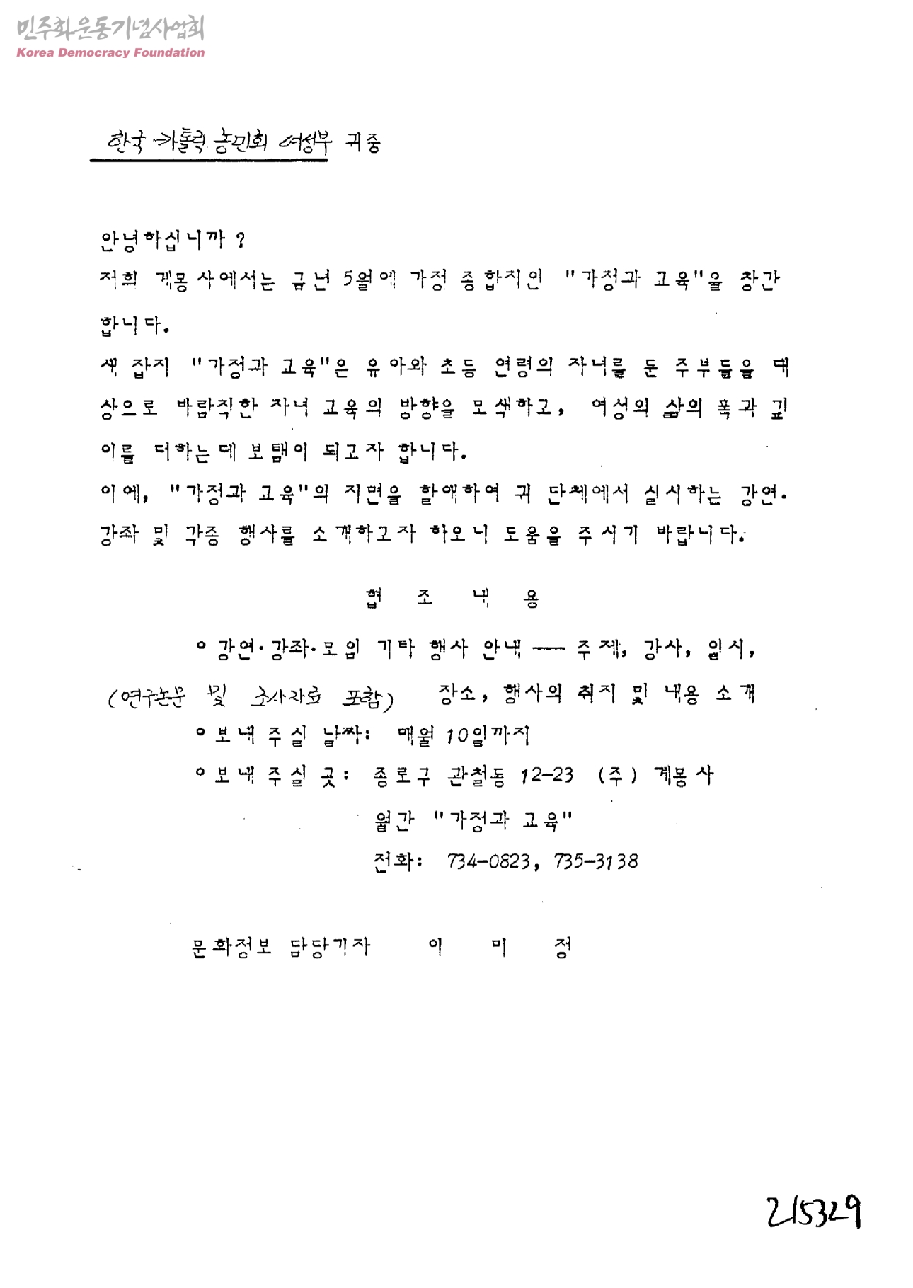 [계몽사기자 이미정이 종합지 '가정과 교육' 창간과 관련하여 한국가톨릭농민회 여성부에 보내는 협조요청문]