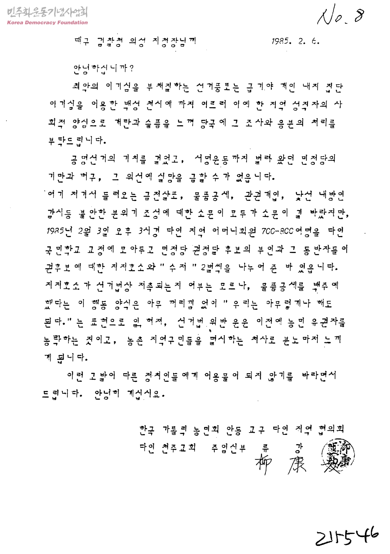 대구 검찰청 의성 지청장님께[민정당 권정달 후보의 선거법 위반 관련-수신:대구검찰청 의성지청장,발신:한국가톨릭농민회 안동교구 다인지역협의회 다인천주교회 주임신부 류강하]