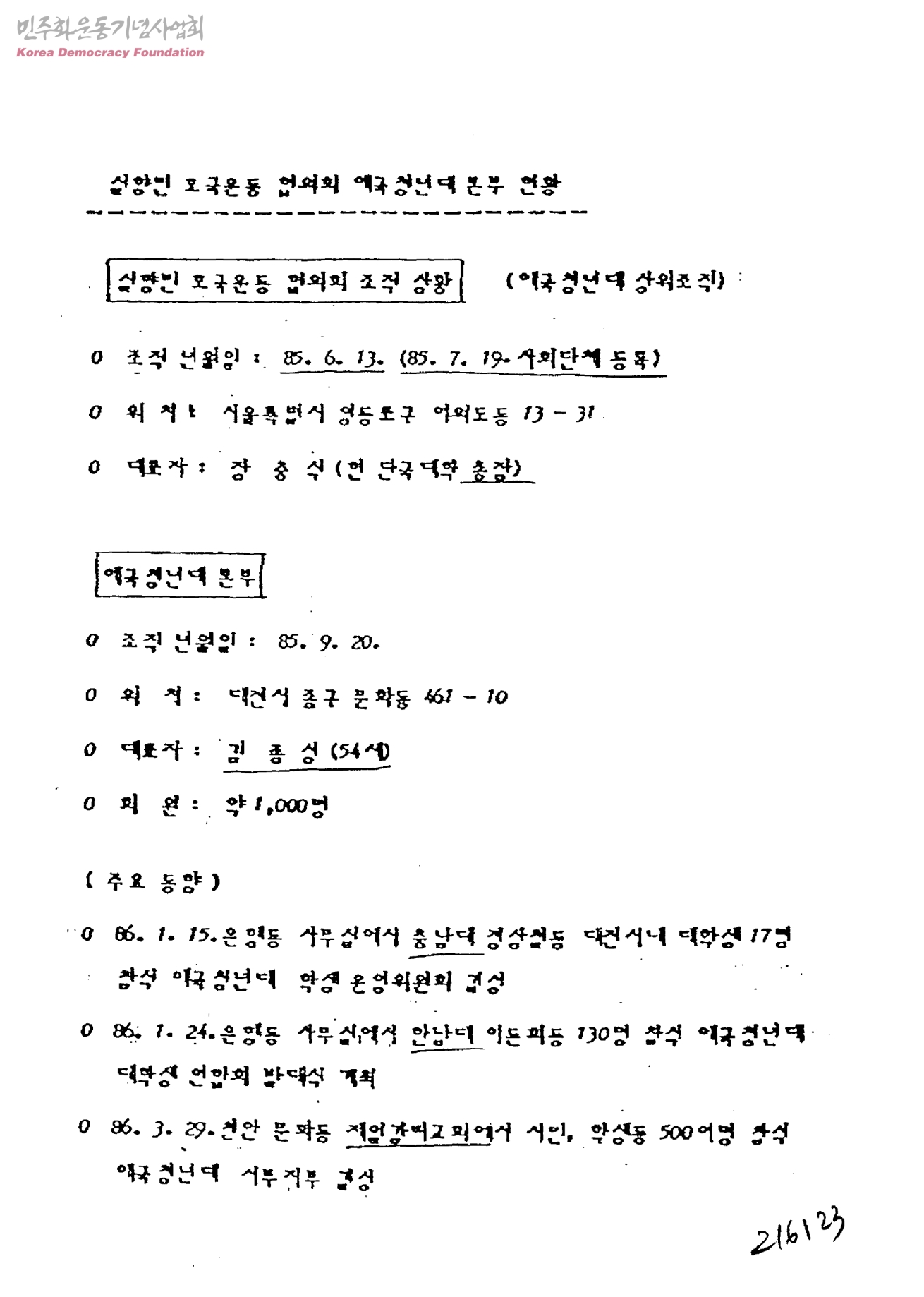[가톨릭농민회 회원 이영철 테러사건 관련자료]실향민 호국운동 협의회 애국청년대 본부 현황