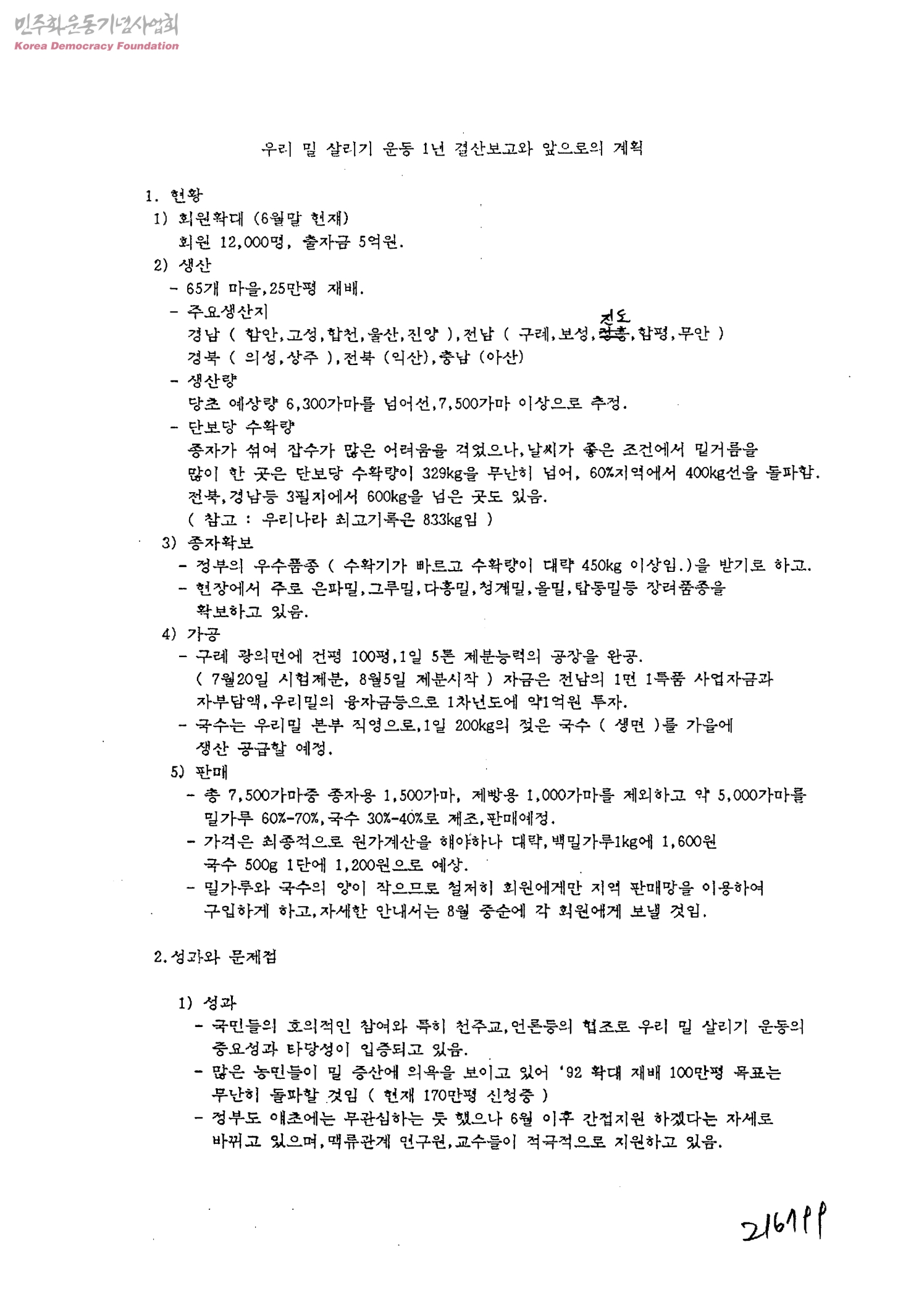 우리 밀 살리기 운동 1년 결산보고와 앞으로의 계획