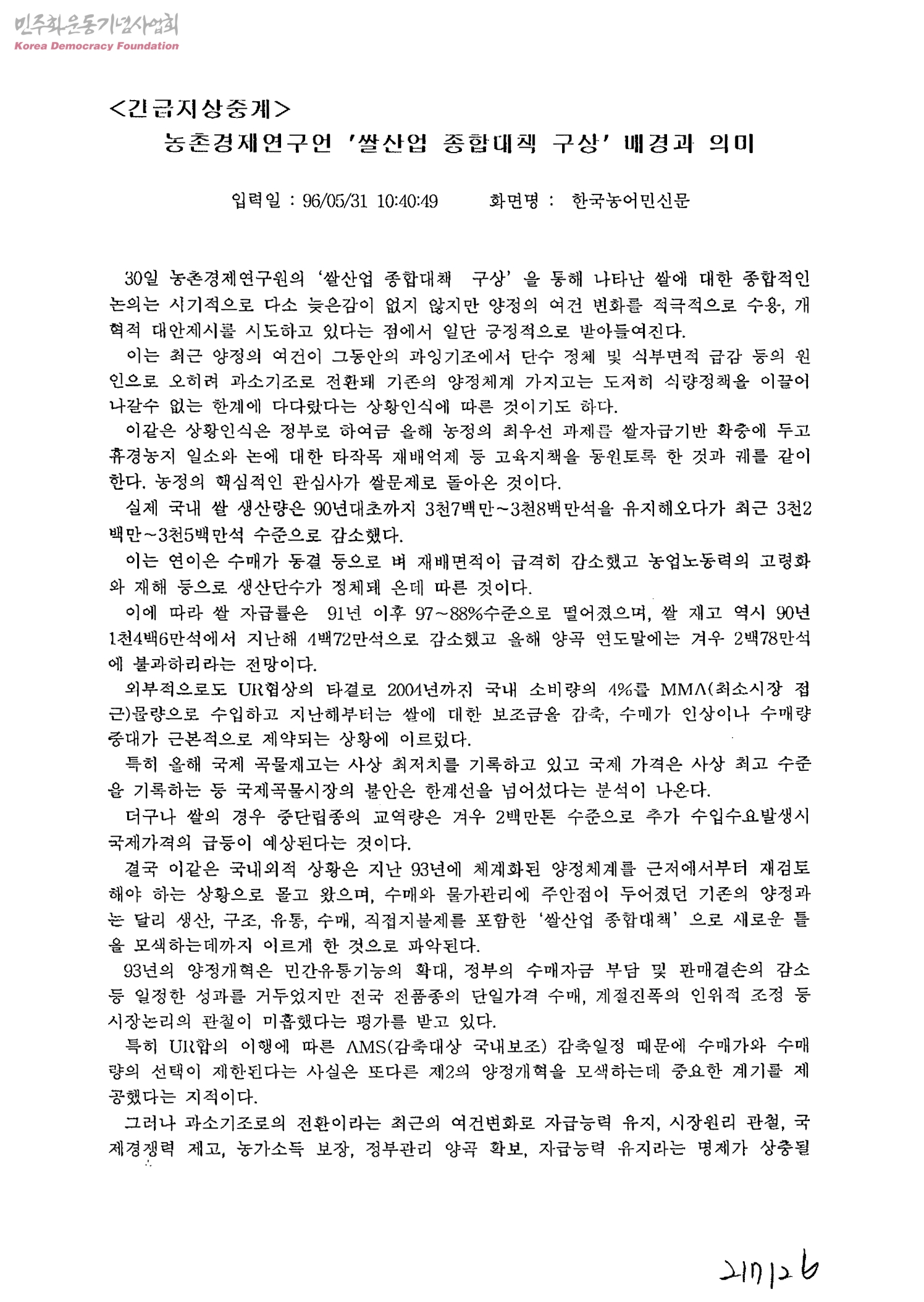 긴급지상중계-농촌경제연구원 쌀산업 종합대책 구상 배경과 의미