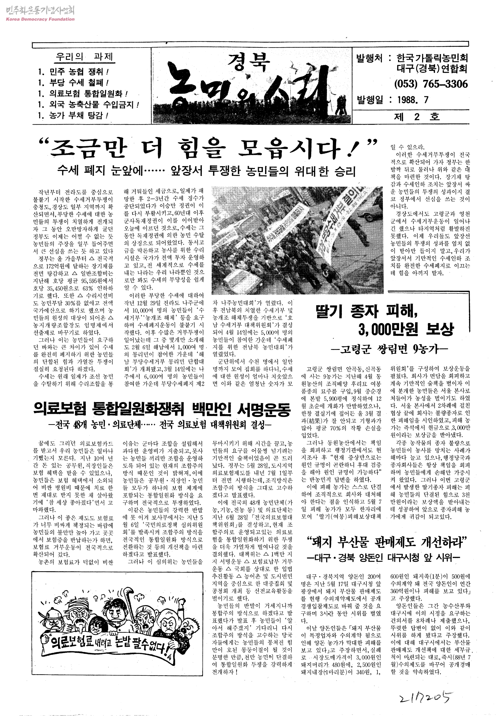 - 1.조금만 더 힘을 모읍시다-수세폐지 눈앞에 ...앞장서 투쟁한 농민들의 위대한 승리 2.의료보험 통합일원화쟁취 백만인 서명운동-전국 48개 농민·의료단체...전국 의료보험 대책위원회 결성 3.딸기 종자 피해. 3000만원 보상-고령군 쌍림면 9농가 4.돼지 부산물 판매제도 개선하라-대구·경북 양돈인 대구시청 앞 시위 5.관제농협 이제는 끝장냅시다-조합장직선제는 농협민주화의 지름길 6.전두환·이순자를 소환·수사하라-부정축재 환수하여 농가부채 탕감 재원으로