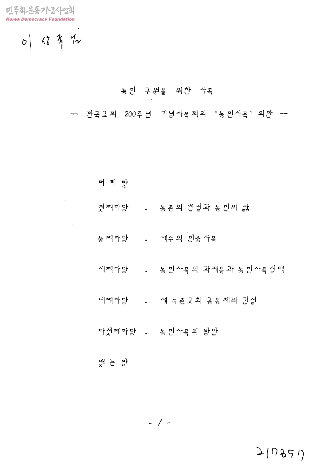 농민 구원을 위한 사목-한국교회 200주년 기념사목회의 '농민사목' 의안