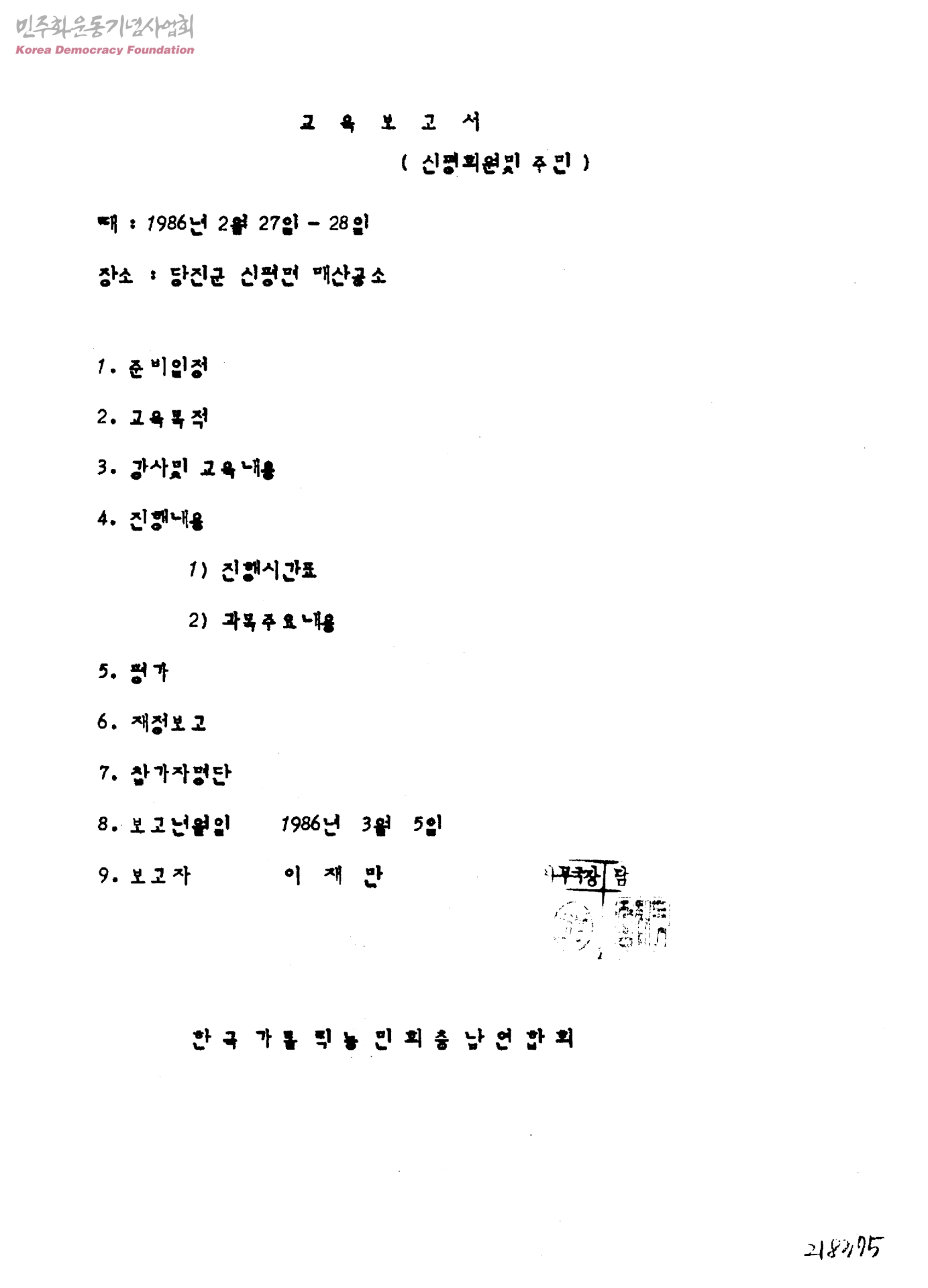 - 준비일정,교육목적,강사 및 교육내용,진행내용,평가,재정보고,참가자명단 행사일시:1986-02-27~28 보고자:이재만