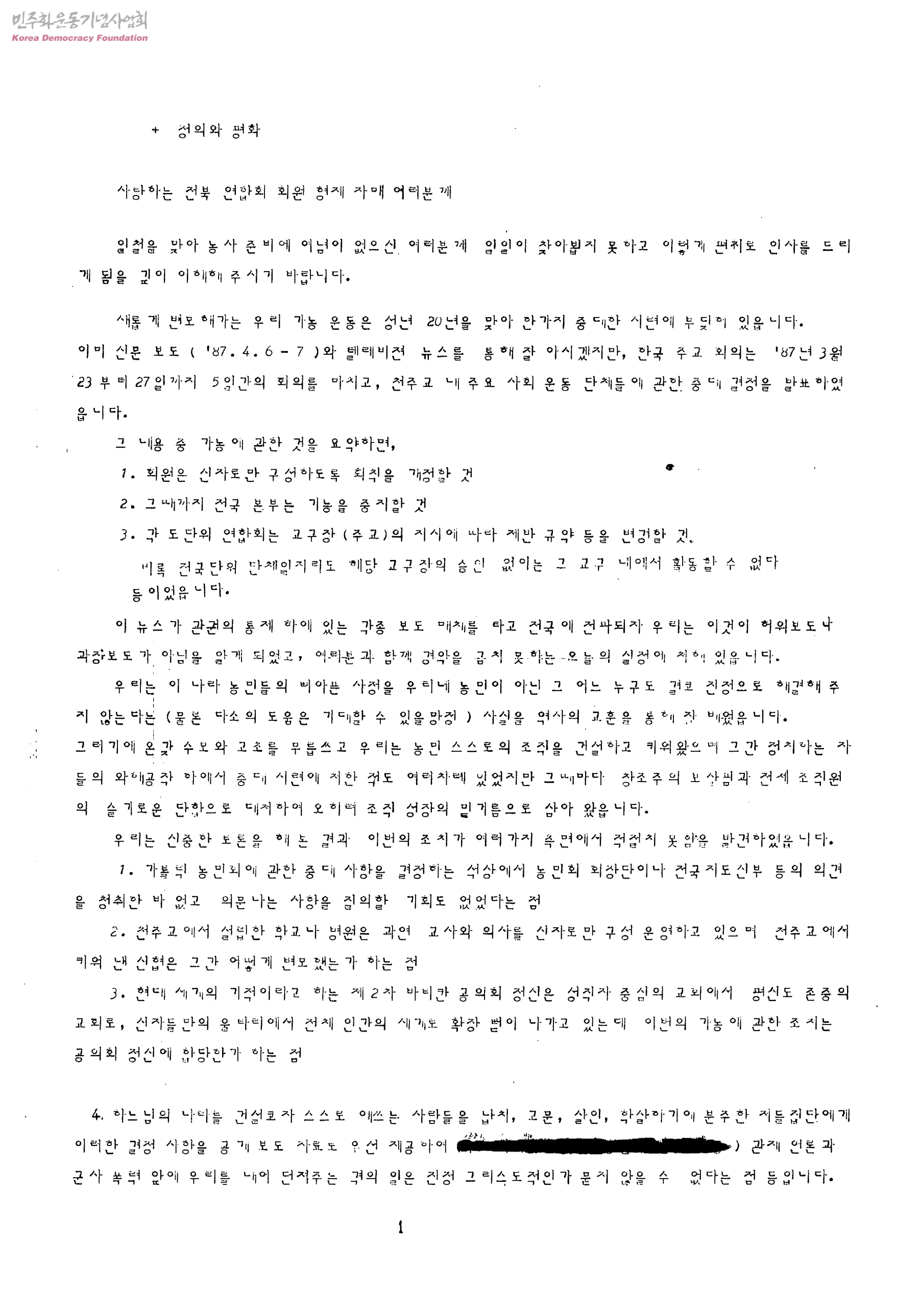 사랑하는 전북 연합회 회원 형제 자매 여러분께[천주교내 주요사회운동단체들에 대한 한국주교회의의 중대결정 사항과 관련]