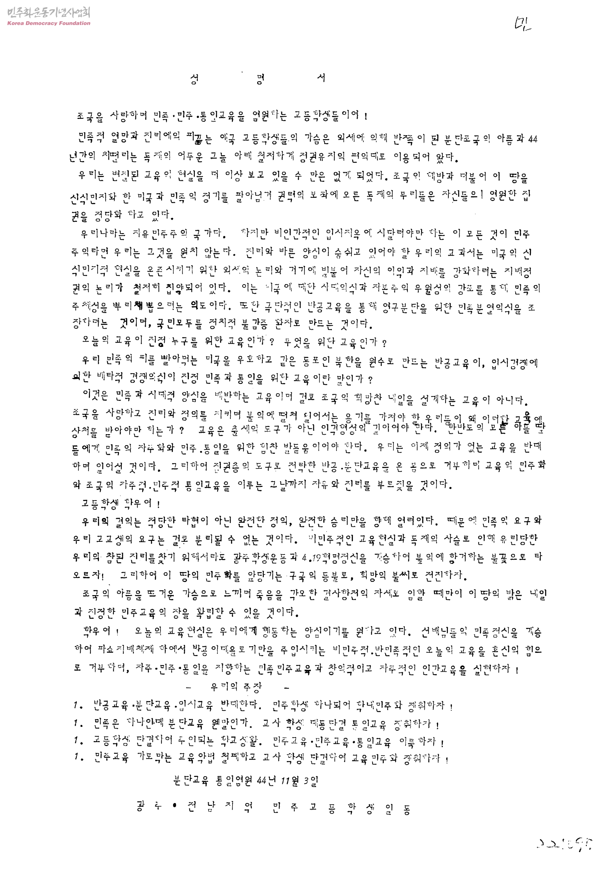 성명서-조국을 사랑하며 민족민주통일교육을 염원하는 고등학생들이여!