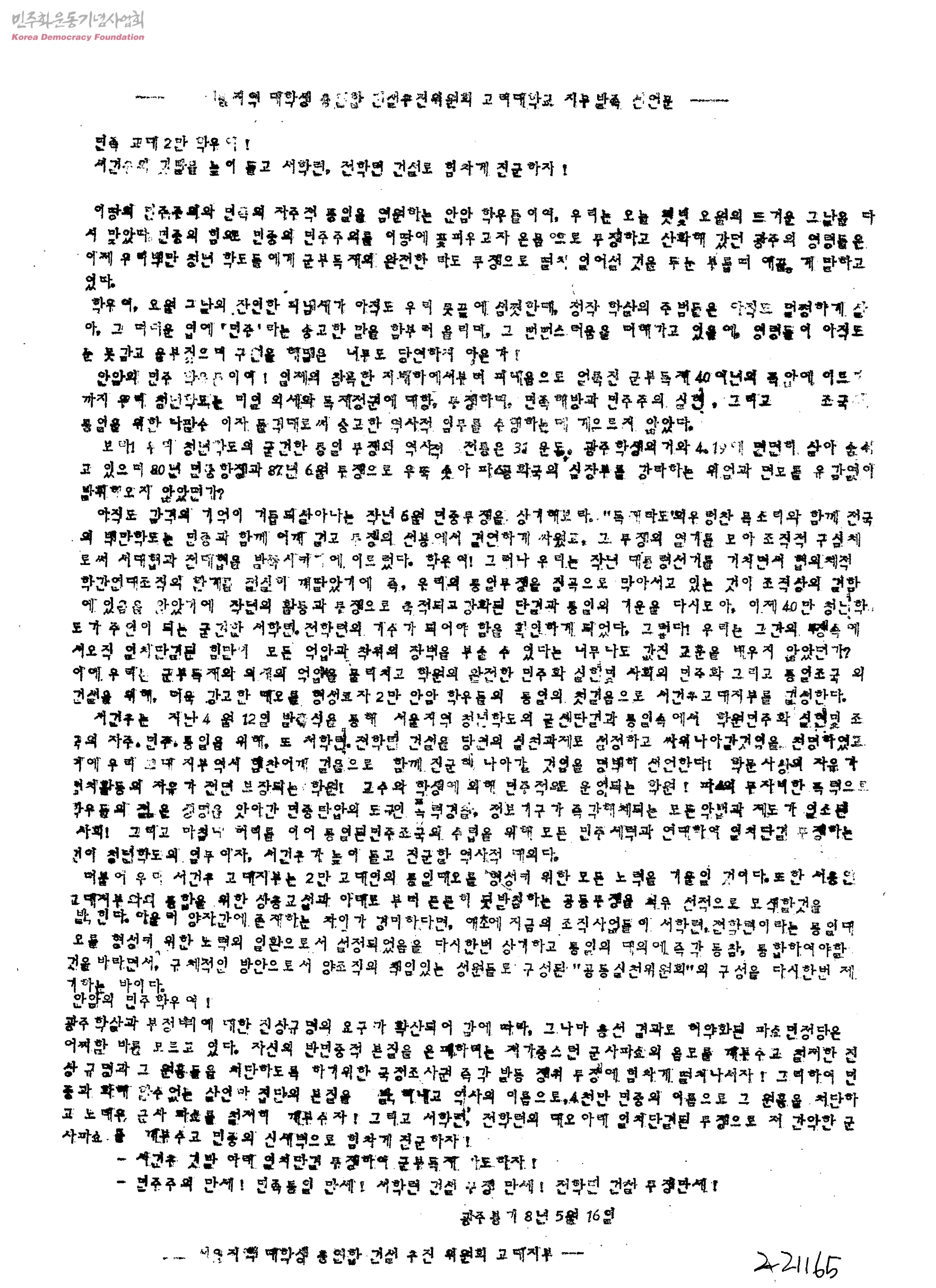 서울지역 대학생 총연합 건설추진위원회 고려대학교 지부발족 선언문