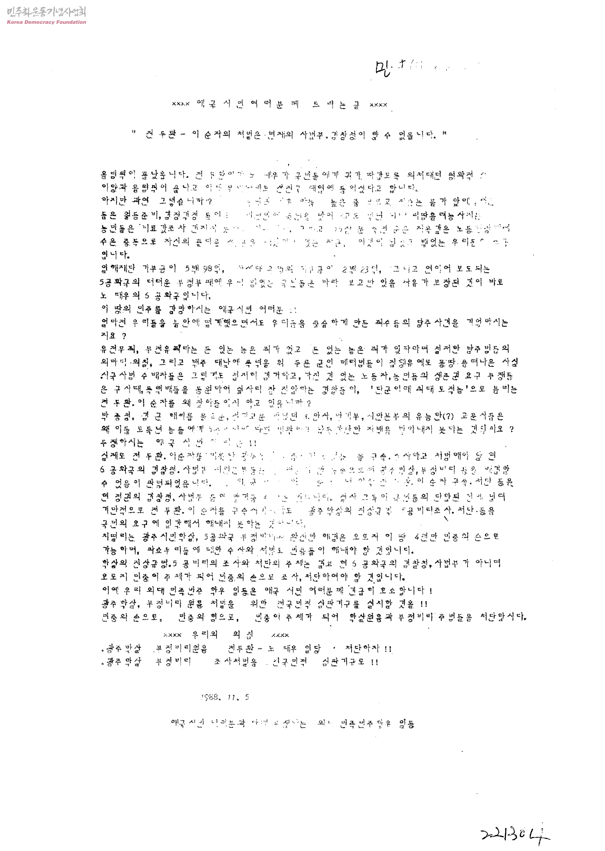 애국시민여러분께 드리는 글-전두환.이순자의 처벌은 현지의 사법부.검철청이 할 수 없읍니다