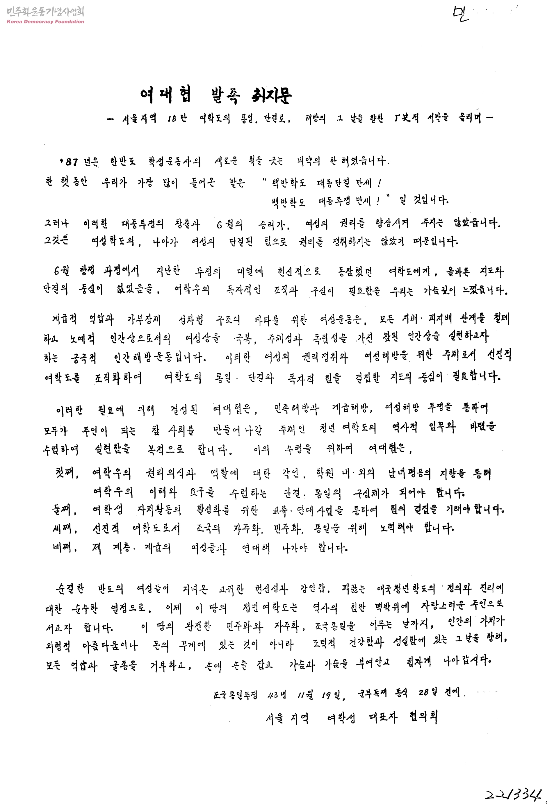 여대협 발족 취지문-서울지역 15만 여학도의 통일, 단결로. 해방의 그 날을 향한 역사적 서막을 올리며