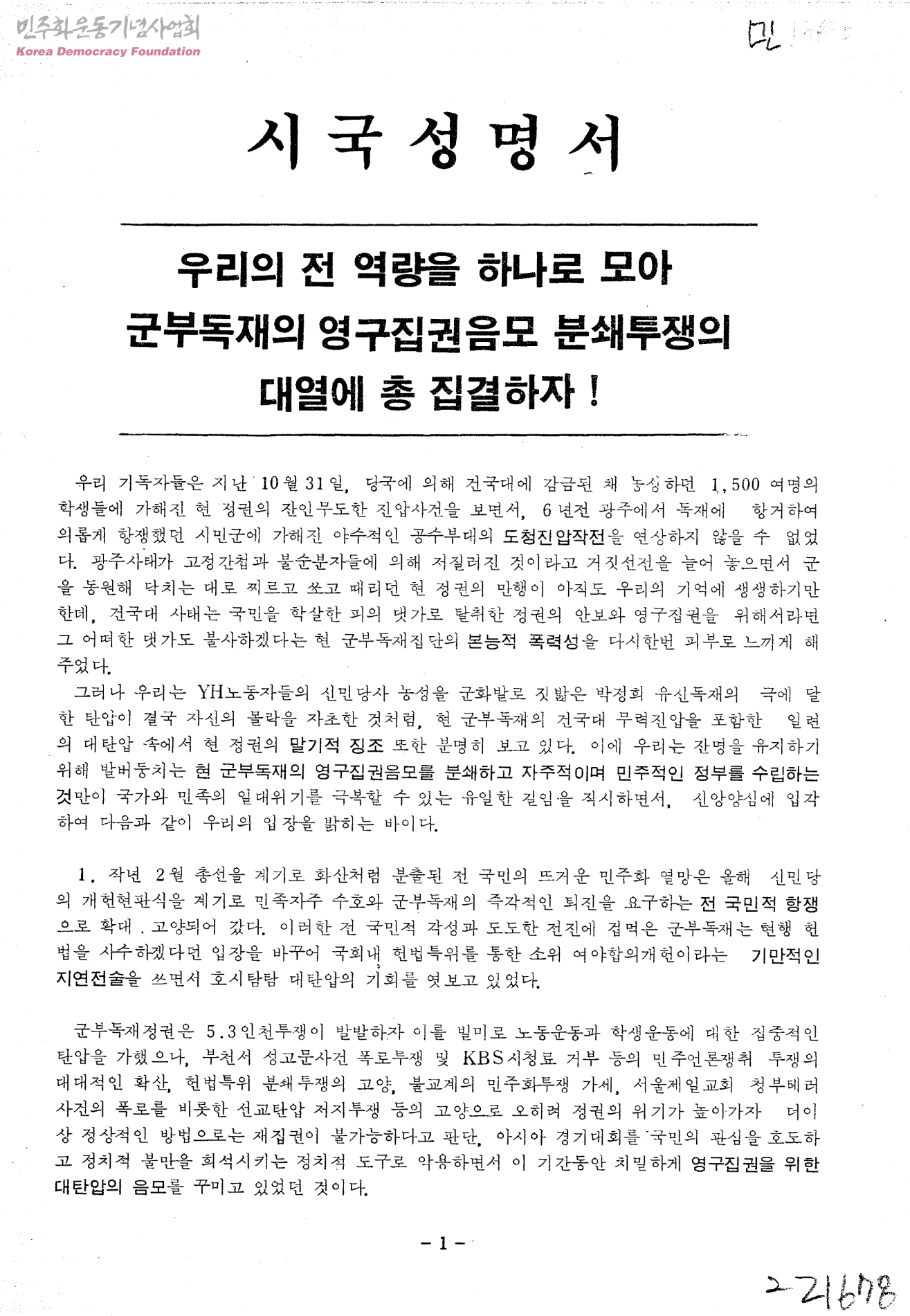 시국성명서-우리의 전 역량을 하나로 모아 군부독재의 영구집권음모 분쇄투쟁의 대열에 총 집결하자