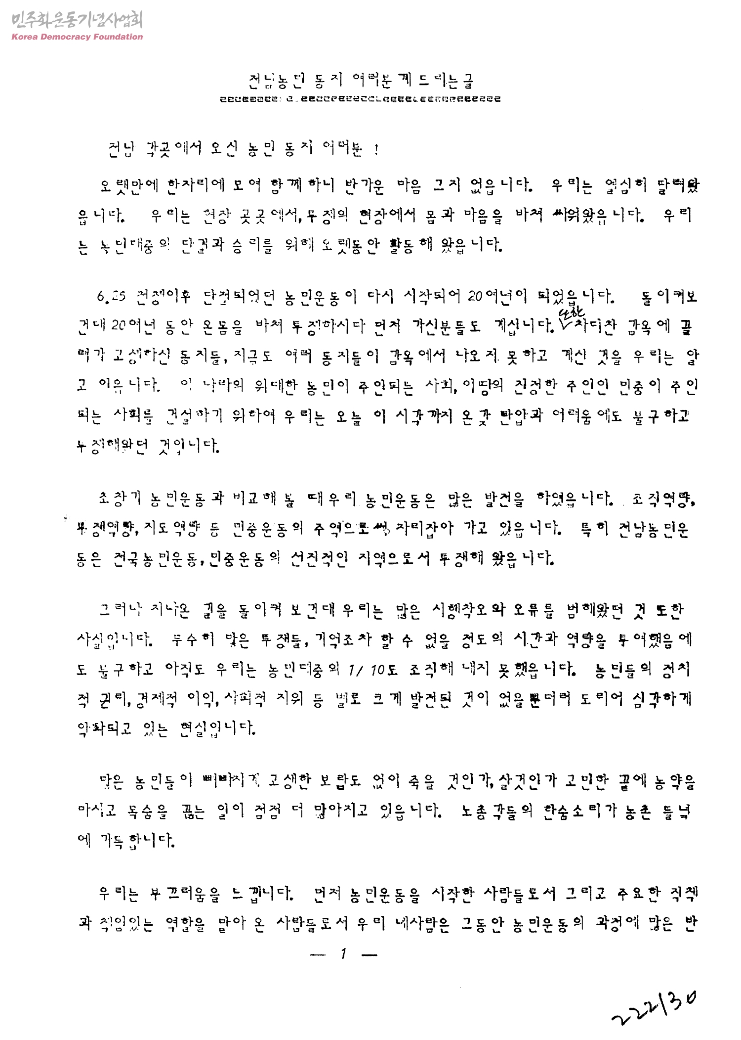 전남농민 동지 여러분께 드리는 글