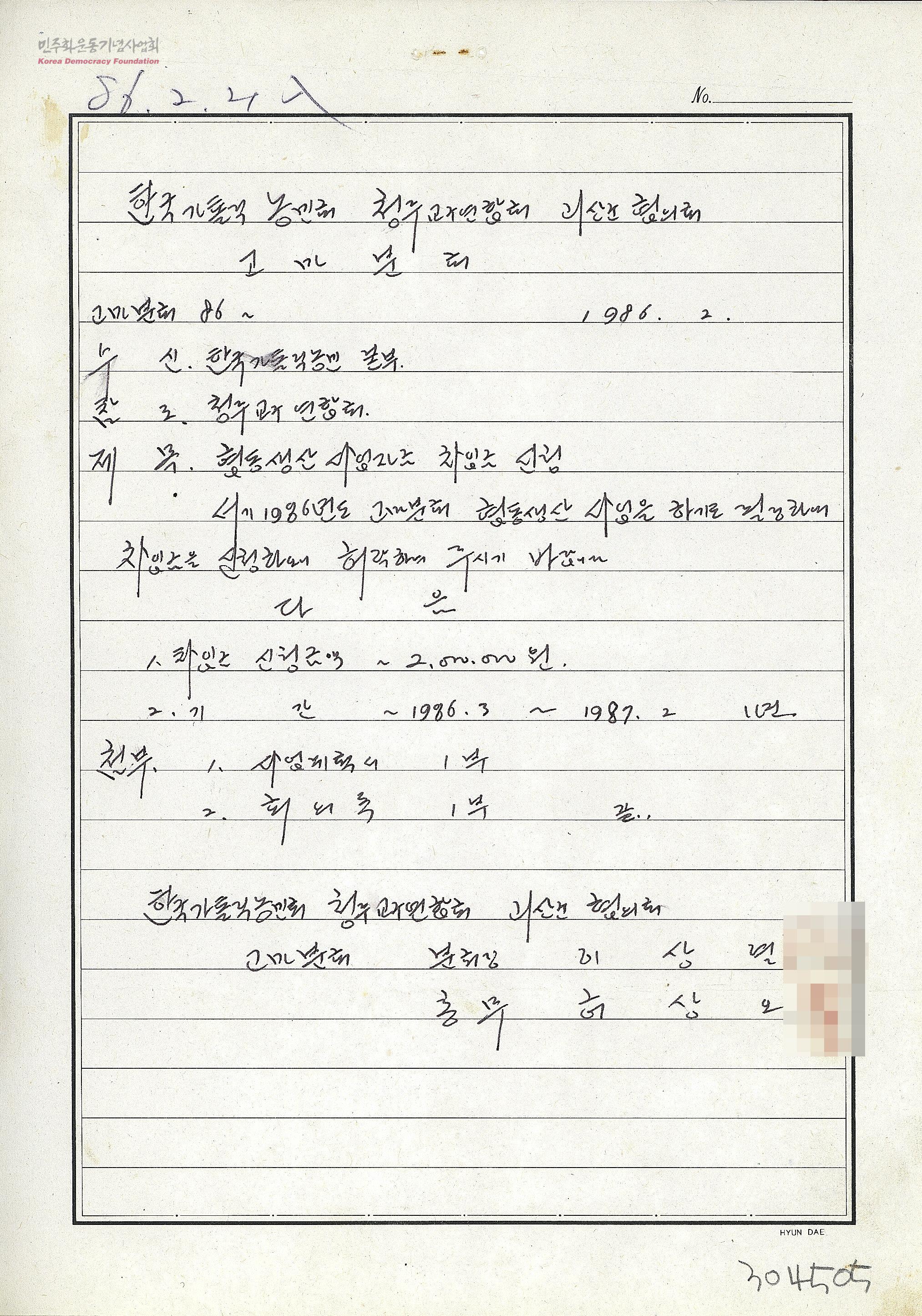 협동생산 사업자금 차임금 신청[수신:한국가톨릭농민회본부,발신:한국가톨릭농민회청주교구연합회괴산군협의회]