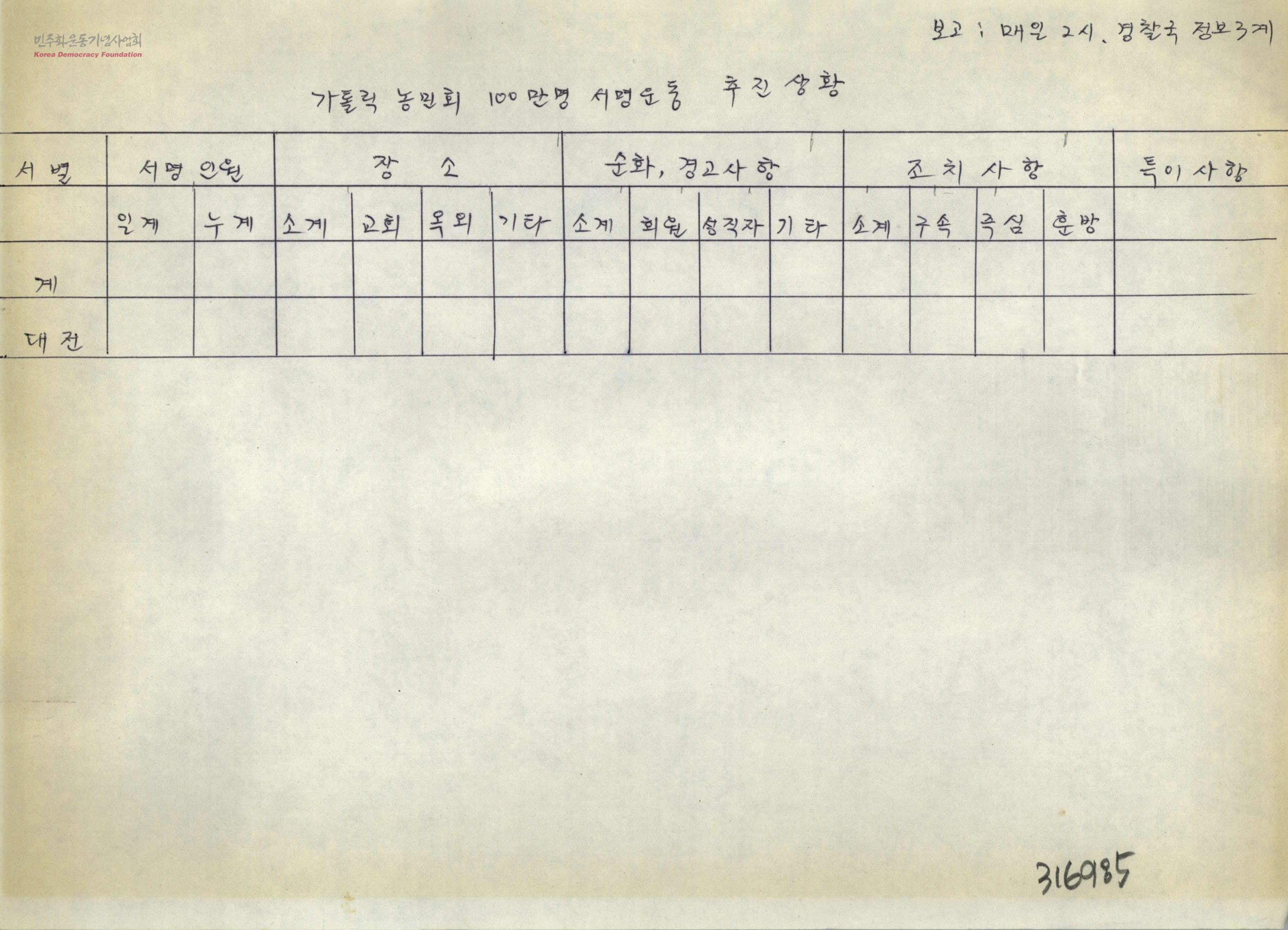 가톨릭농민회 100만명 서명운동 추진상황[표]