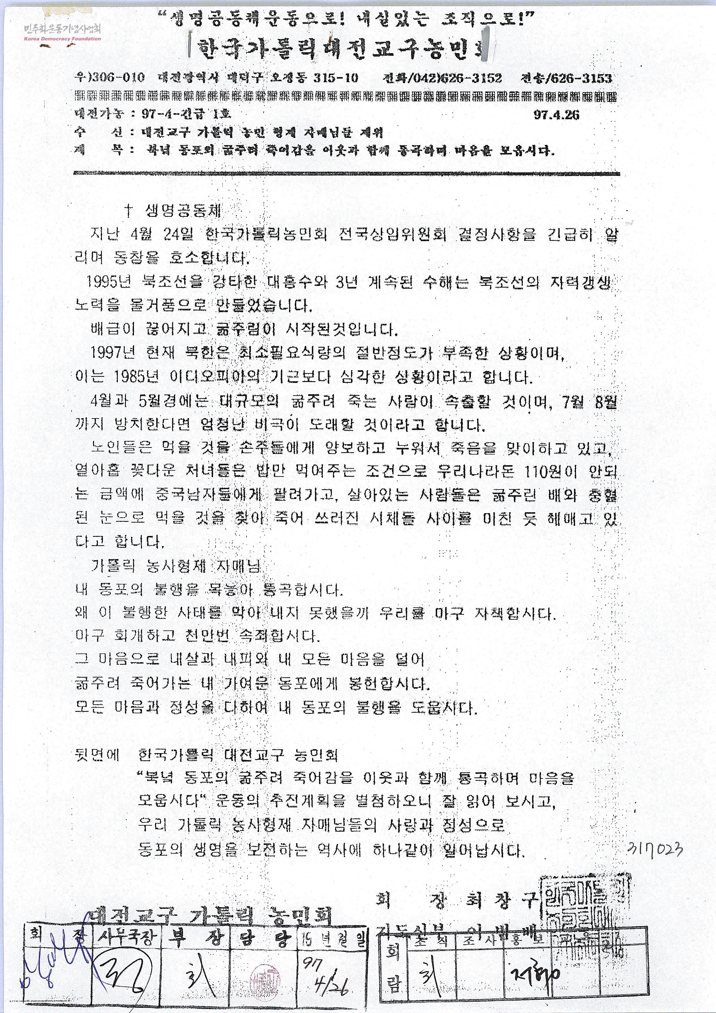 북녘 동포의 굶주려 죽어감을 이웃과 함께 통곡하며 마음을 모읍시다[수신:한국가톨릭농민회,발신:한국가톨릭대전교구농민회]