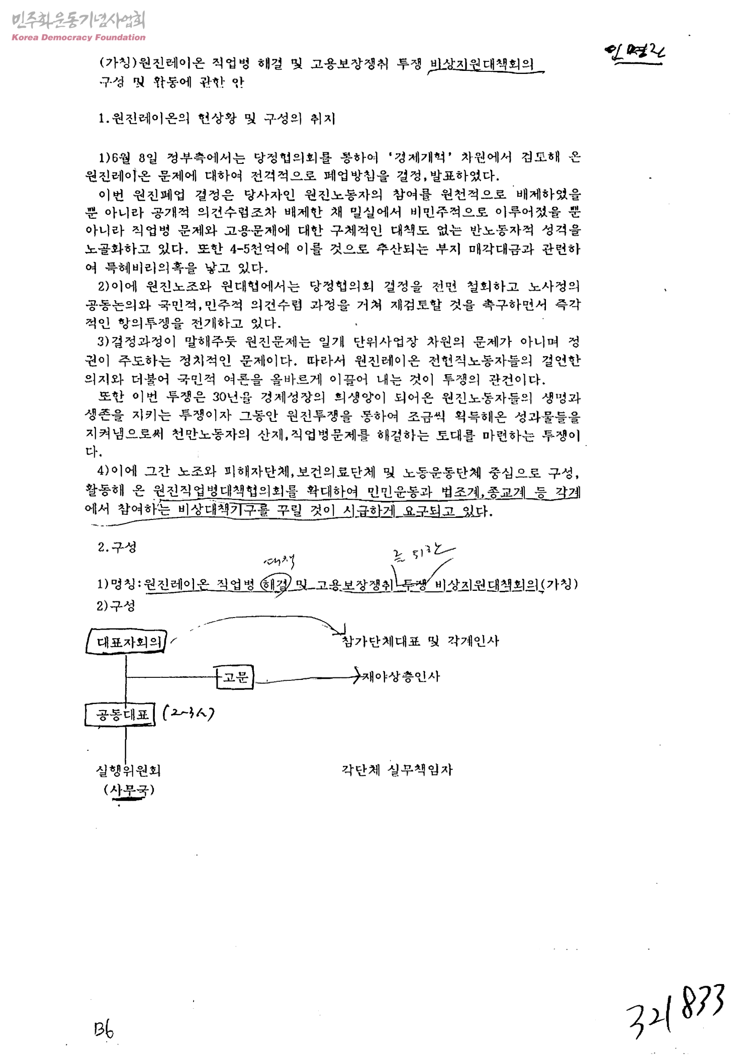 가칭 원진레이온 직업병해결 및 고용보장쟁취투쟁 비상지원대책회의 구성 및 활동에 관한 안