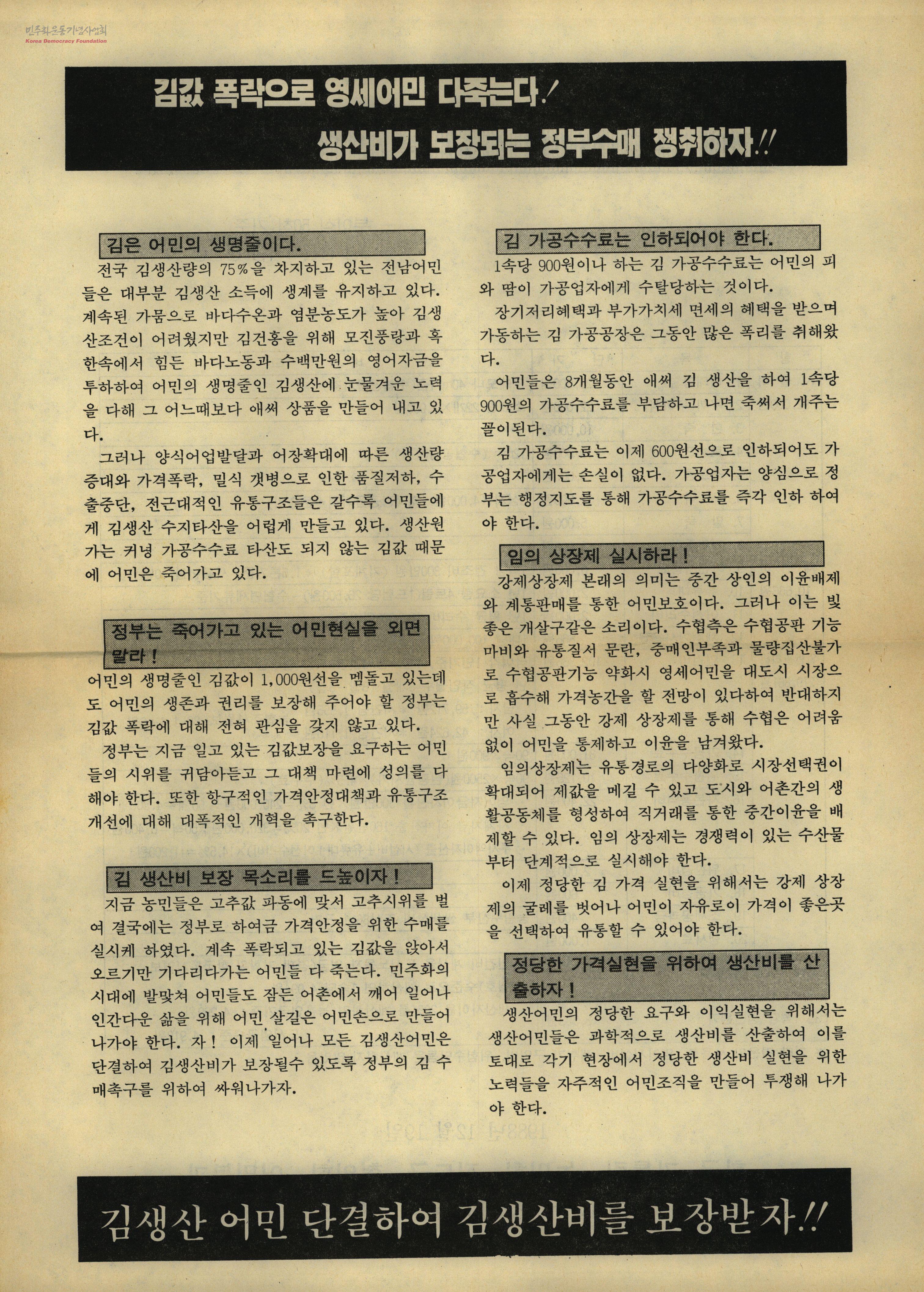 - 김값 폭륵으로 영세어민 다죽는다! 생산비가 보장되는 정부수매 쟁취하자!