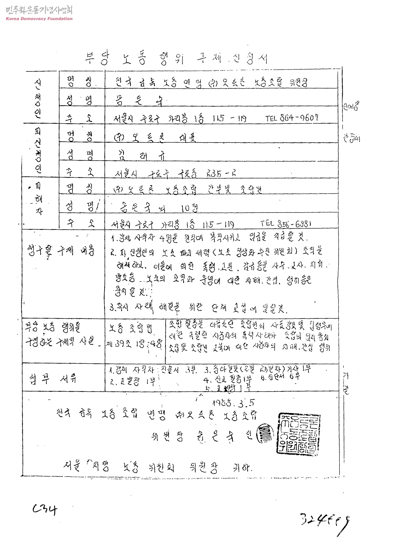 - 부당노동행위 구제신청서, 사건 경위, 첨부: 1. 강제 사직자 신술서 3부 2. 고발장 1부 3. 동아일보(2월 25일자) 기사 4. 신고 필증 1부 5. 고소장 1부 6. 진단서 6부