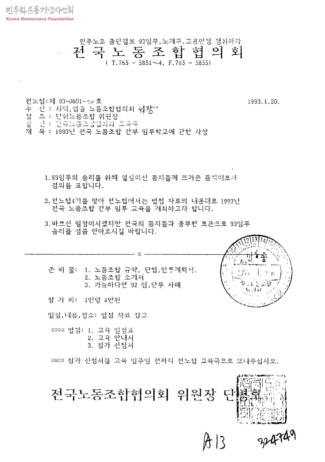 1993년 전국 노동조합 간부 임투학교에 관한 사항( 수신; 지역, 업종 노동조합협의회, 발신; 전국노동조합협의회 교육국)