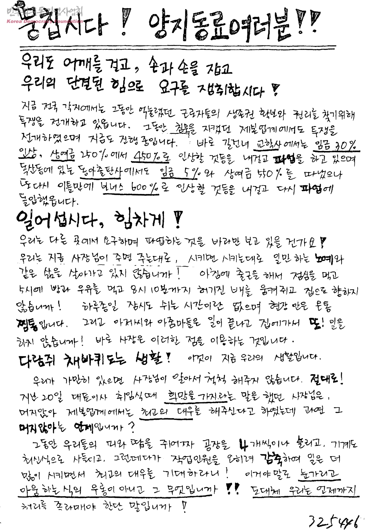 뭉칩시다! 양지 동료 여러분[임금인상과 근로조건 및 노동조합 결성과 관련]