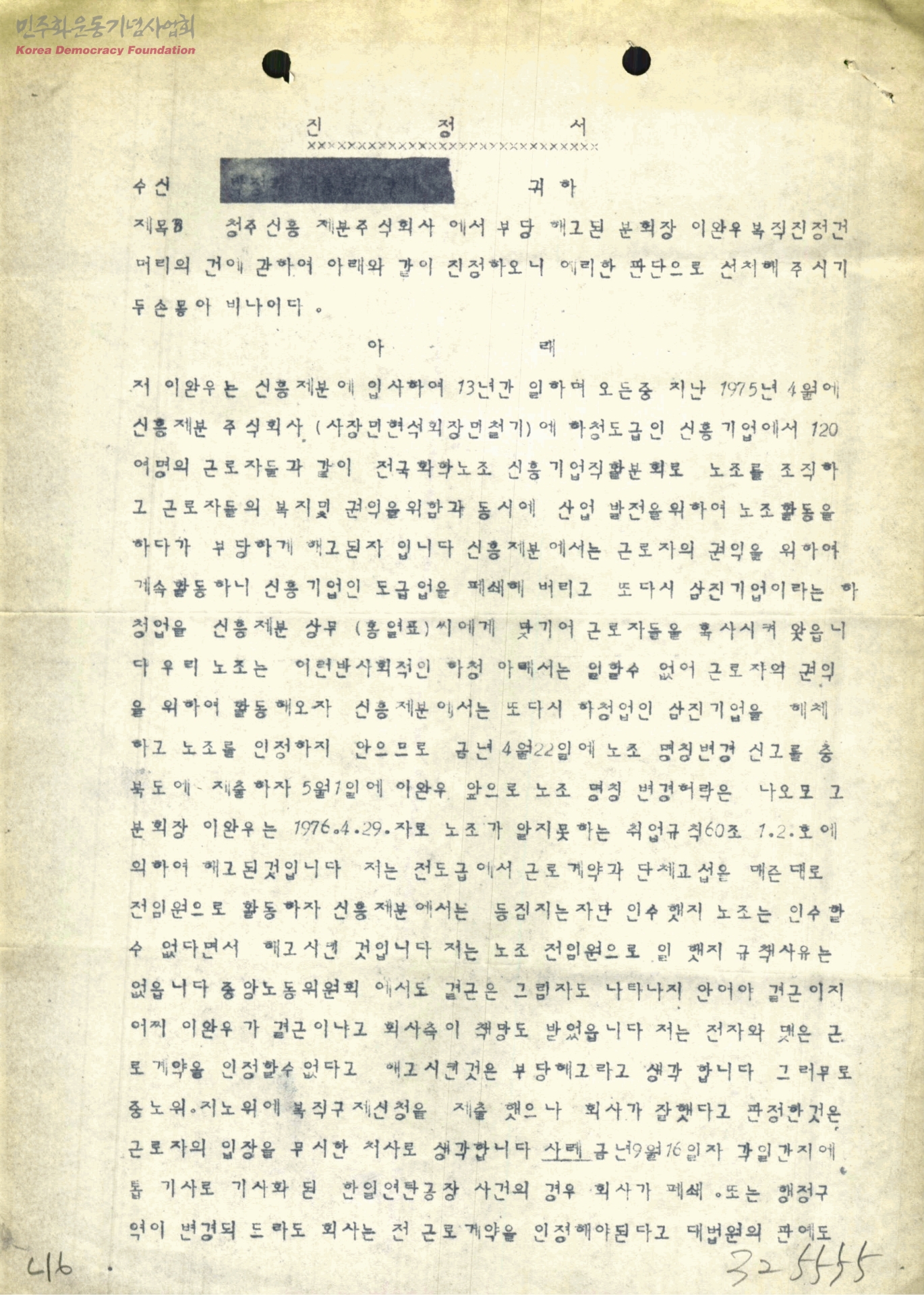 진정서신흥제분에서 부당해고된 이완우복직진정건에 대한]