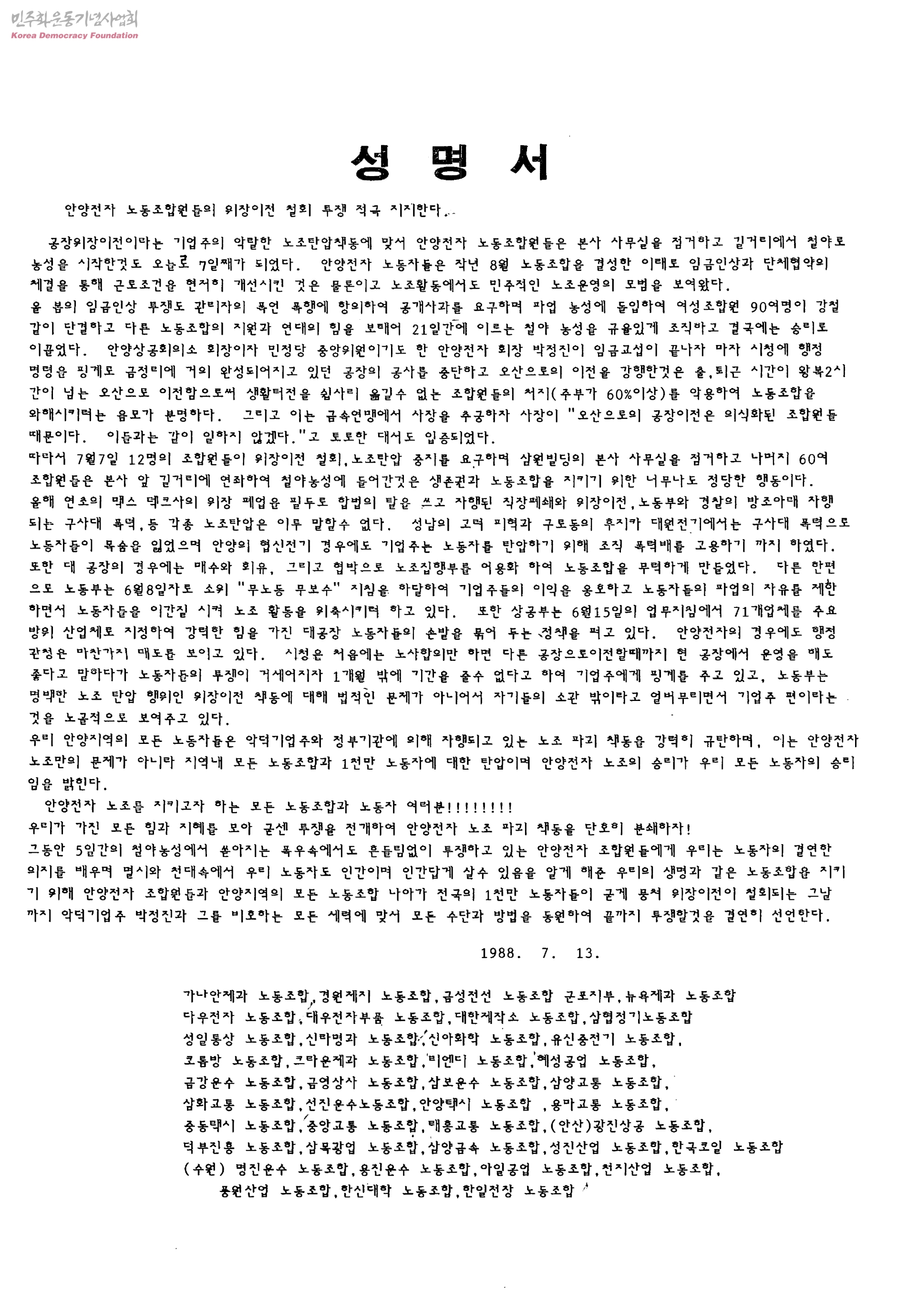 성명서-안양전자 노동조합원들의 위장이전 철회 투쟁 적극 지지한다