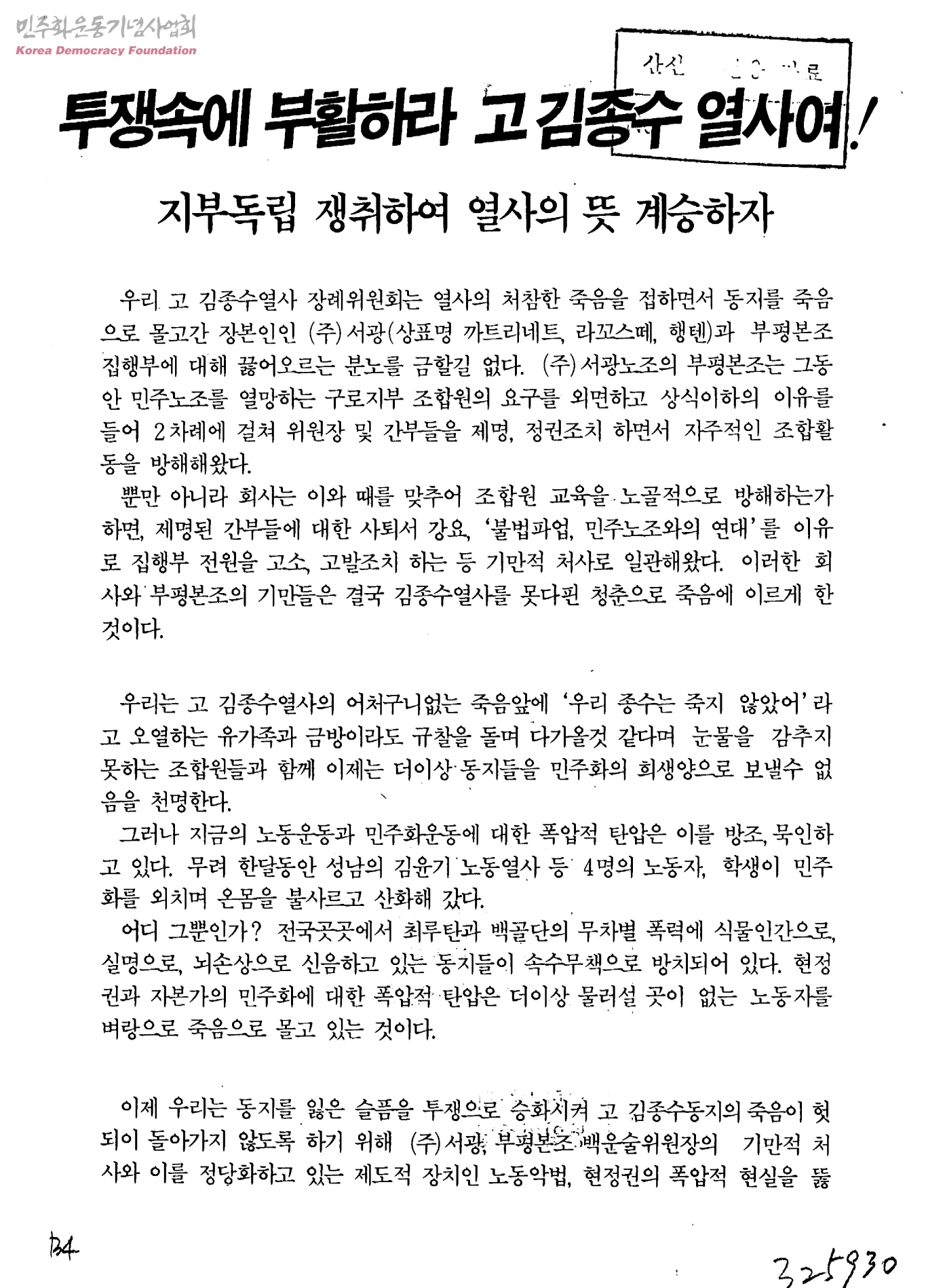 투쟁속에 부활하라 고 김종수 열사여!-지부독립 쟁취하여 열사의 뜻 계승하자