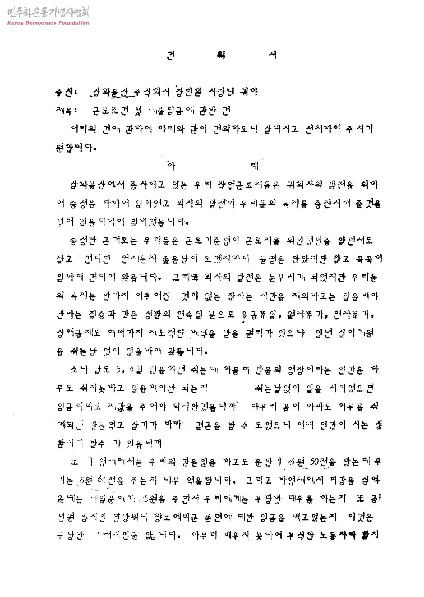 건의서-근로조건 및 체불임금에 관한건[수신:삼화물산장인환사장님,발신:삼화물산상하차반근로자일동]