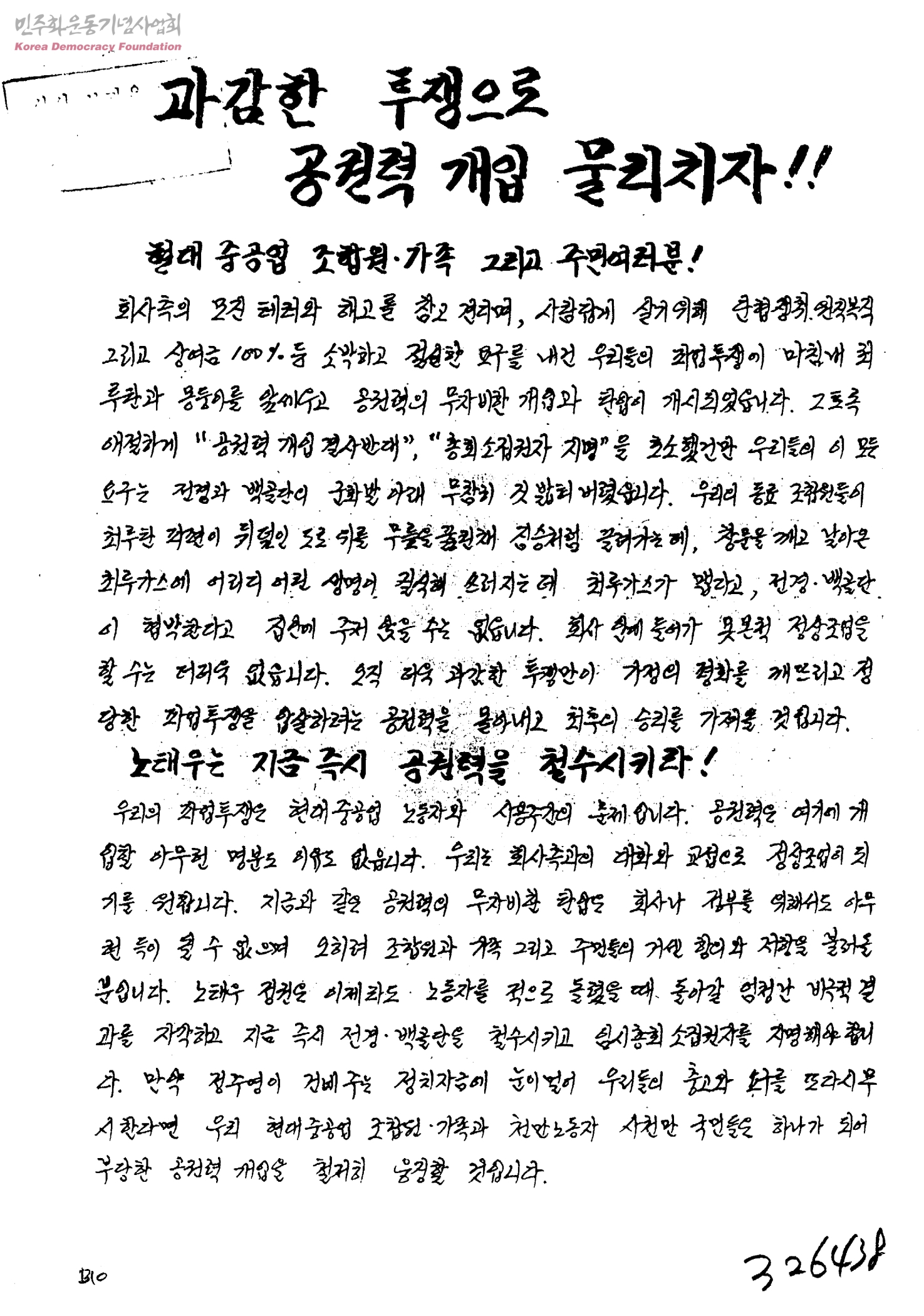 과감한 투쟁으로 공권력 개입 물리치자